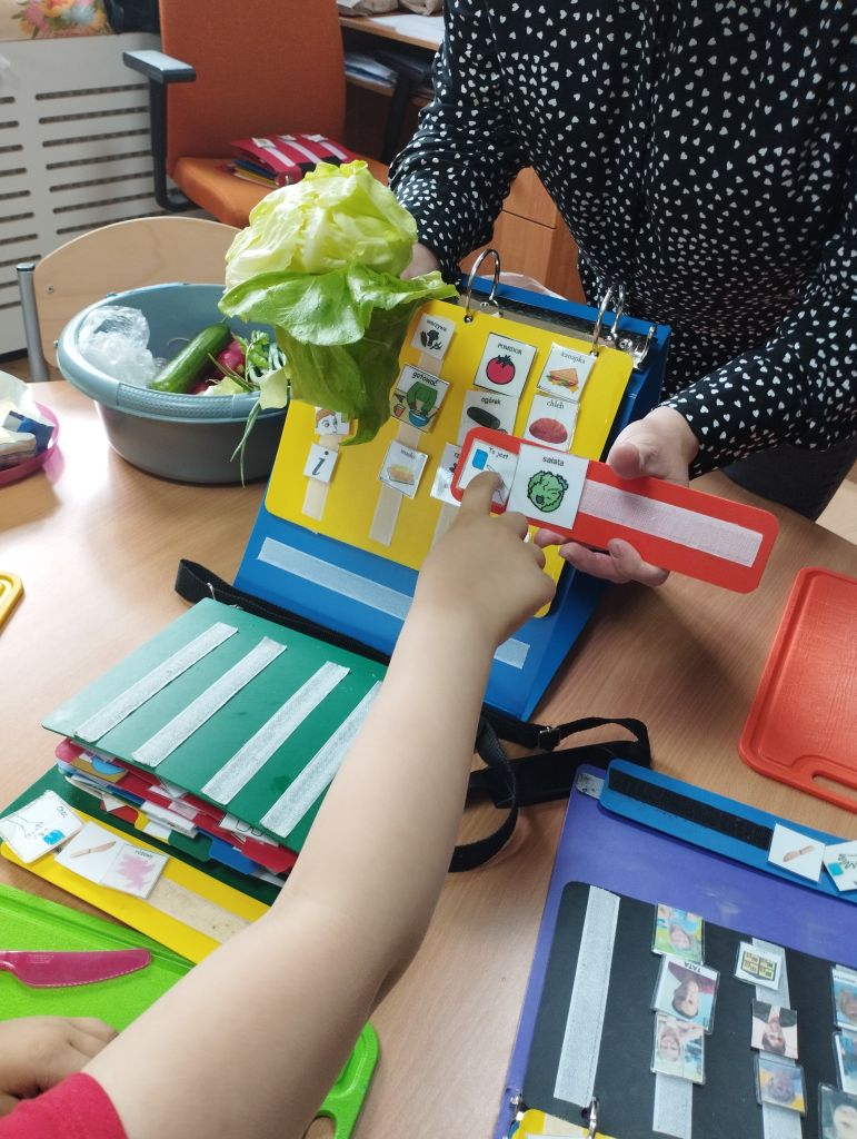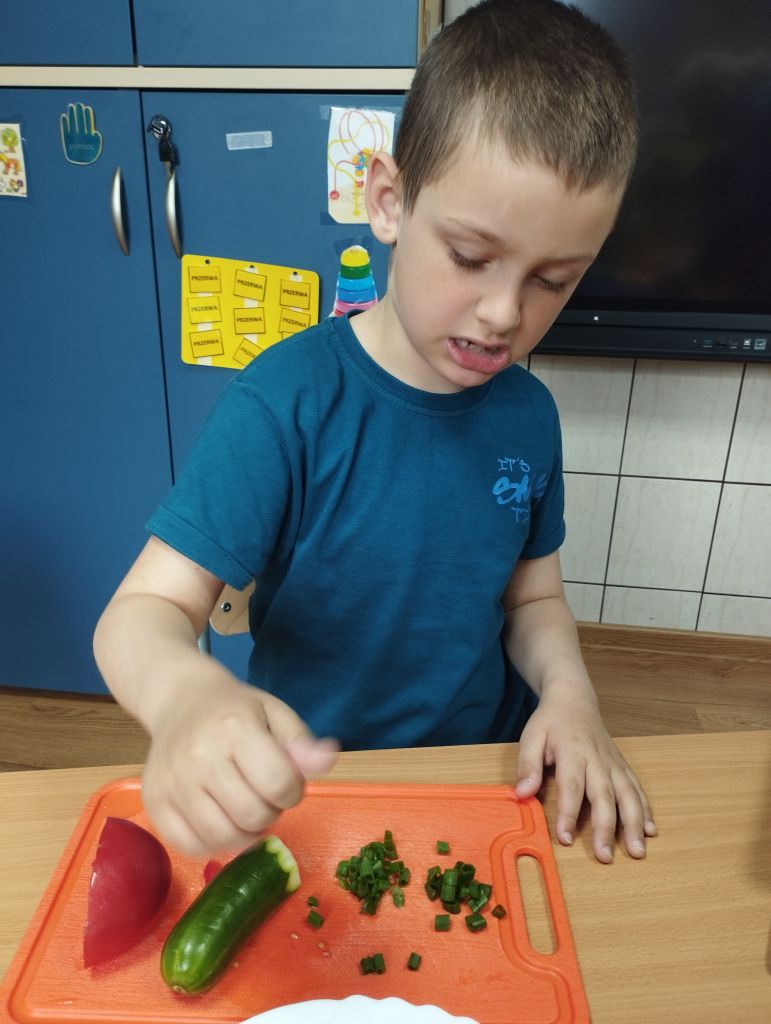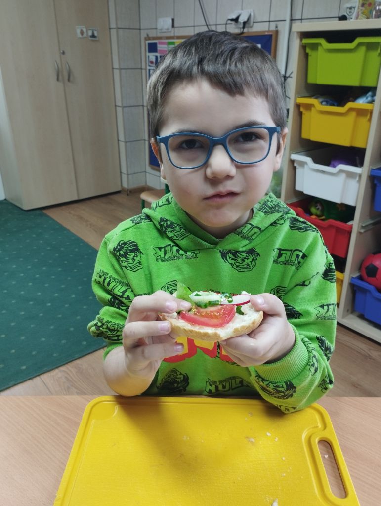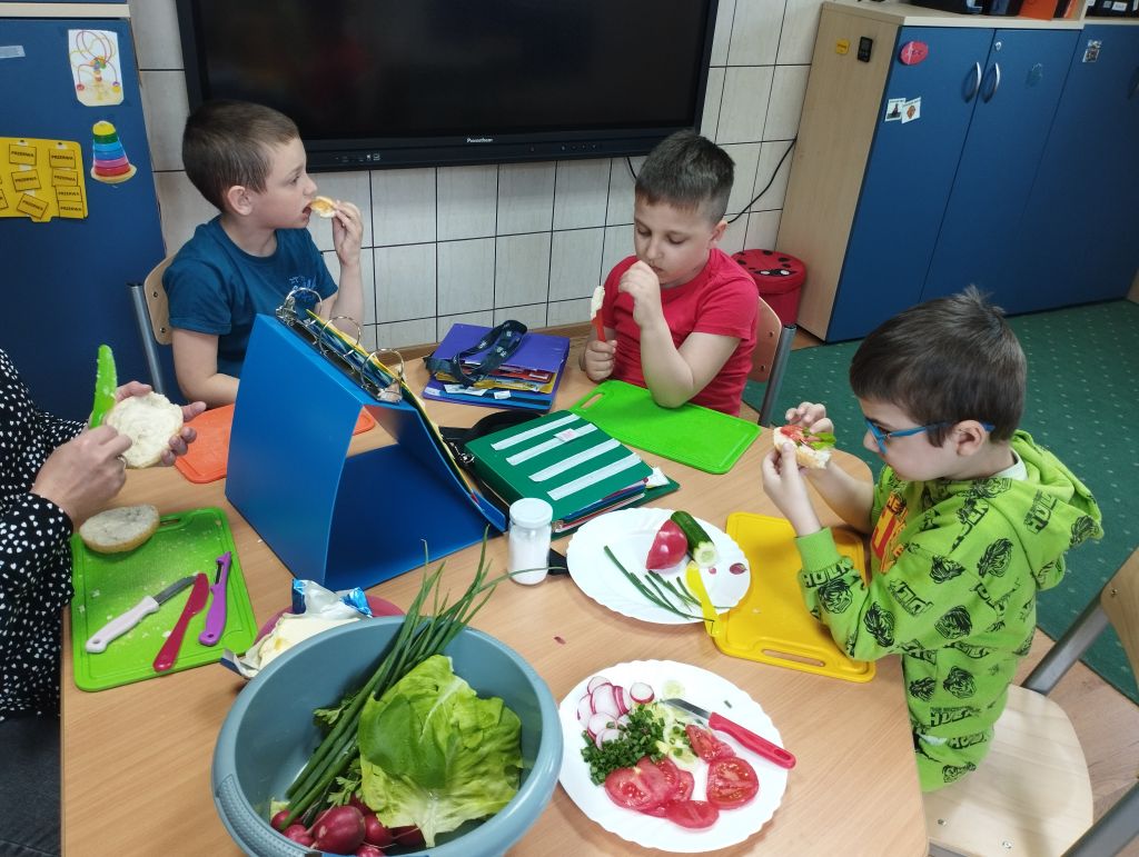 Dzieci z zaangażowaniem nazywały warzywa , smarowały masłem bułki i wybierały warzywa na kanapki, które zjadały z apetytem.