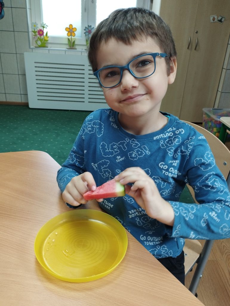 Dzieci poznawały różne owoce utrwalały ich nazwy i próbowały jak smakują, z apetytem zajadały te słodsze. Większość pokochała arbuza i truskawki, borówki, brzoskwinie i morele nie przypadły im do gustu. Było zdrowo ,smacznie i kolorowo.