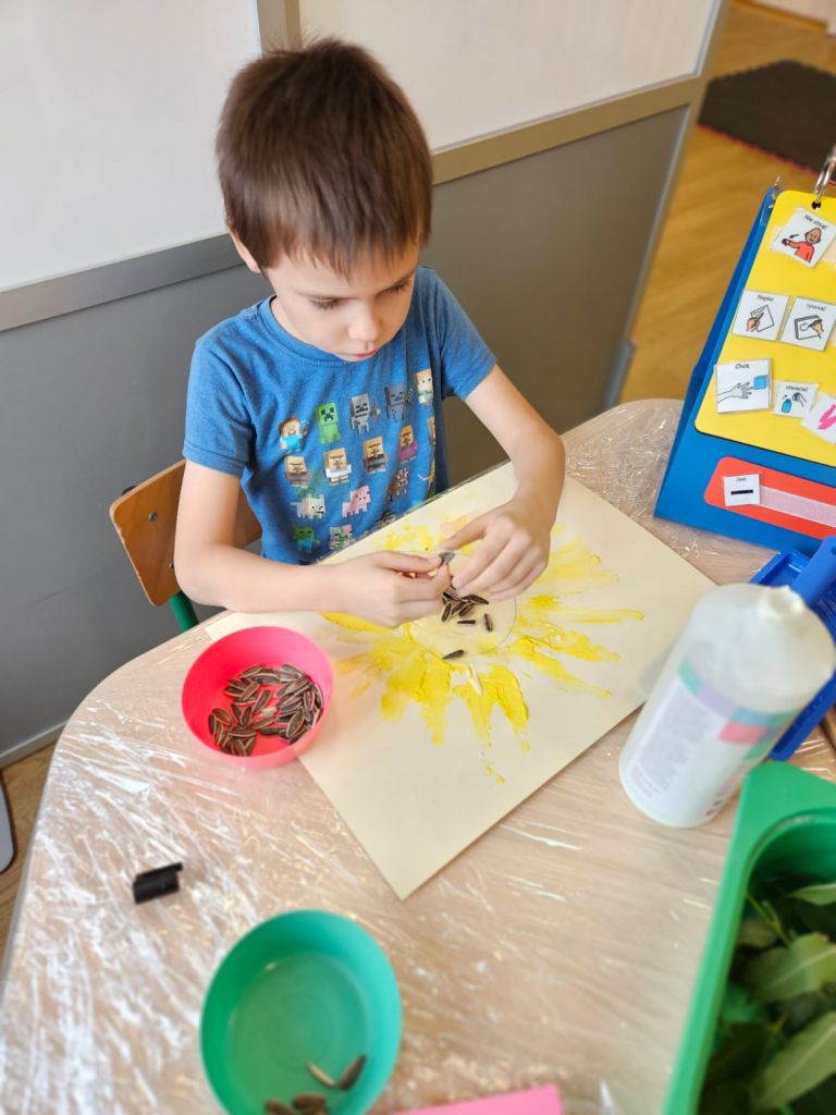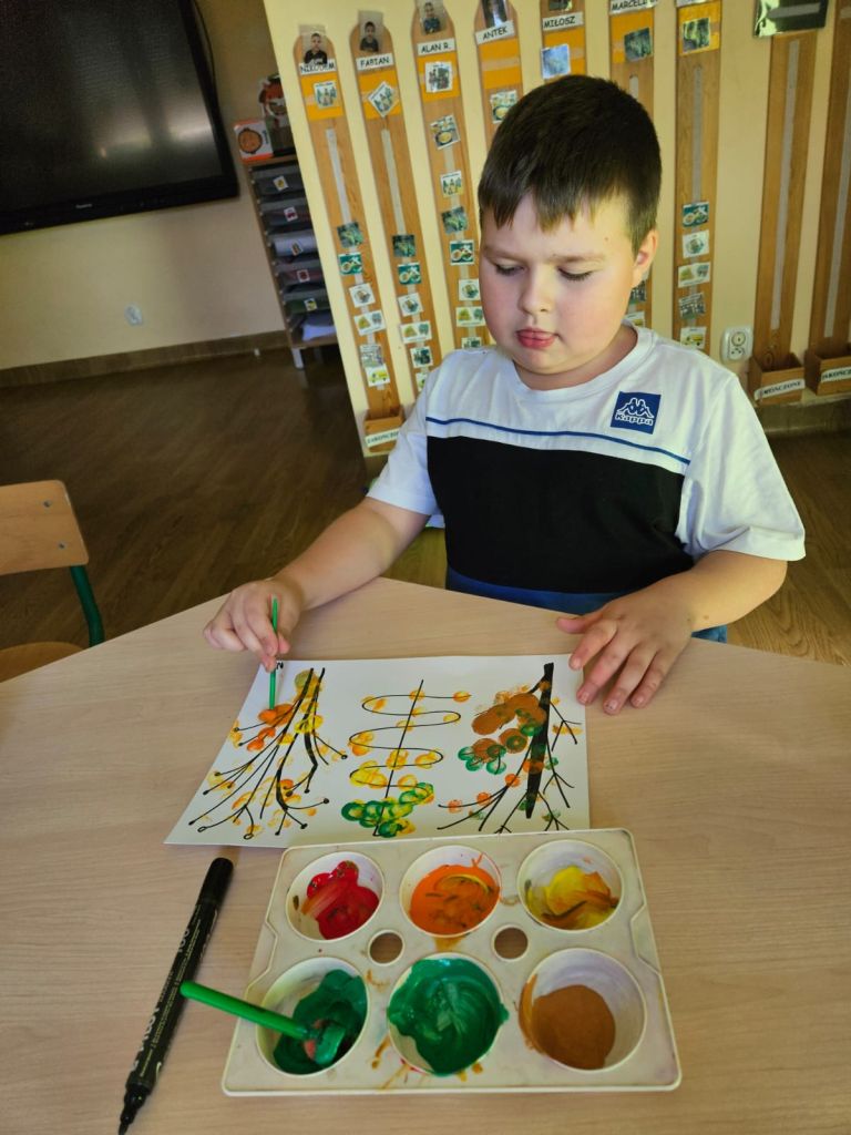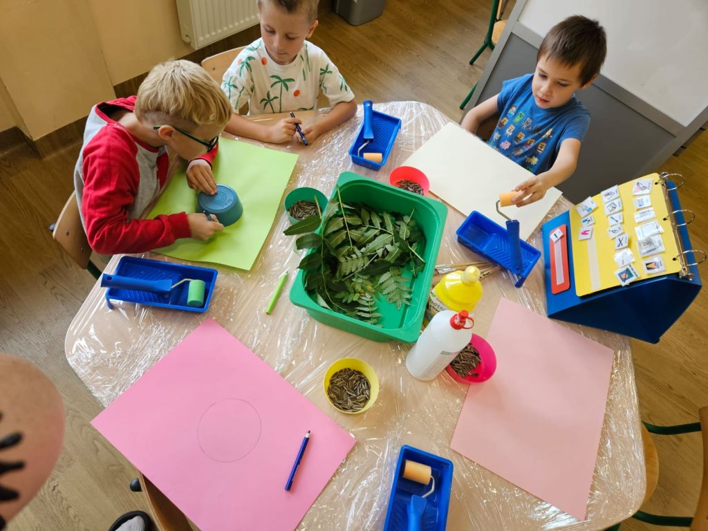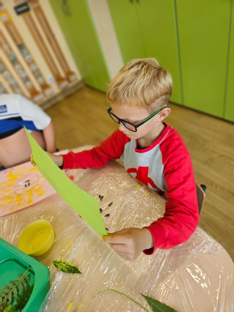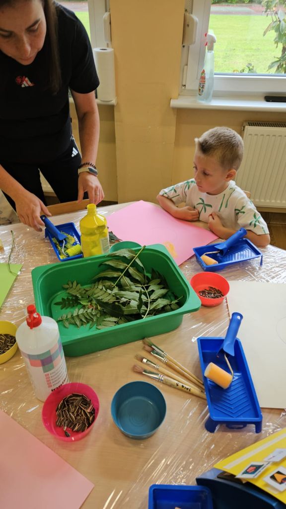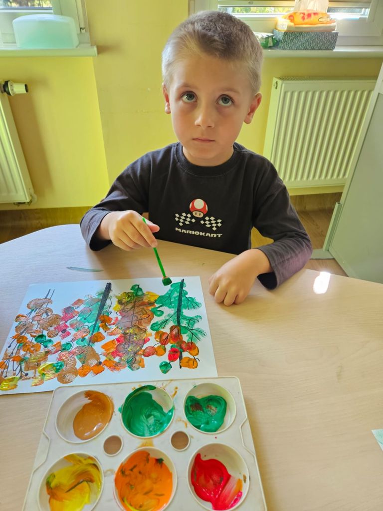 Podczas zajęć plastycznych tworzyliśmy prace o tematyce jesiennej – kolorowe liście, drzewa i owoce. Nie zabrakło także elementów sensoryki – dzieci miały możliwość doświadczać różnorodnych faktur, zapachów i kształtów, co sprawiło im dużo radości.