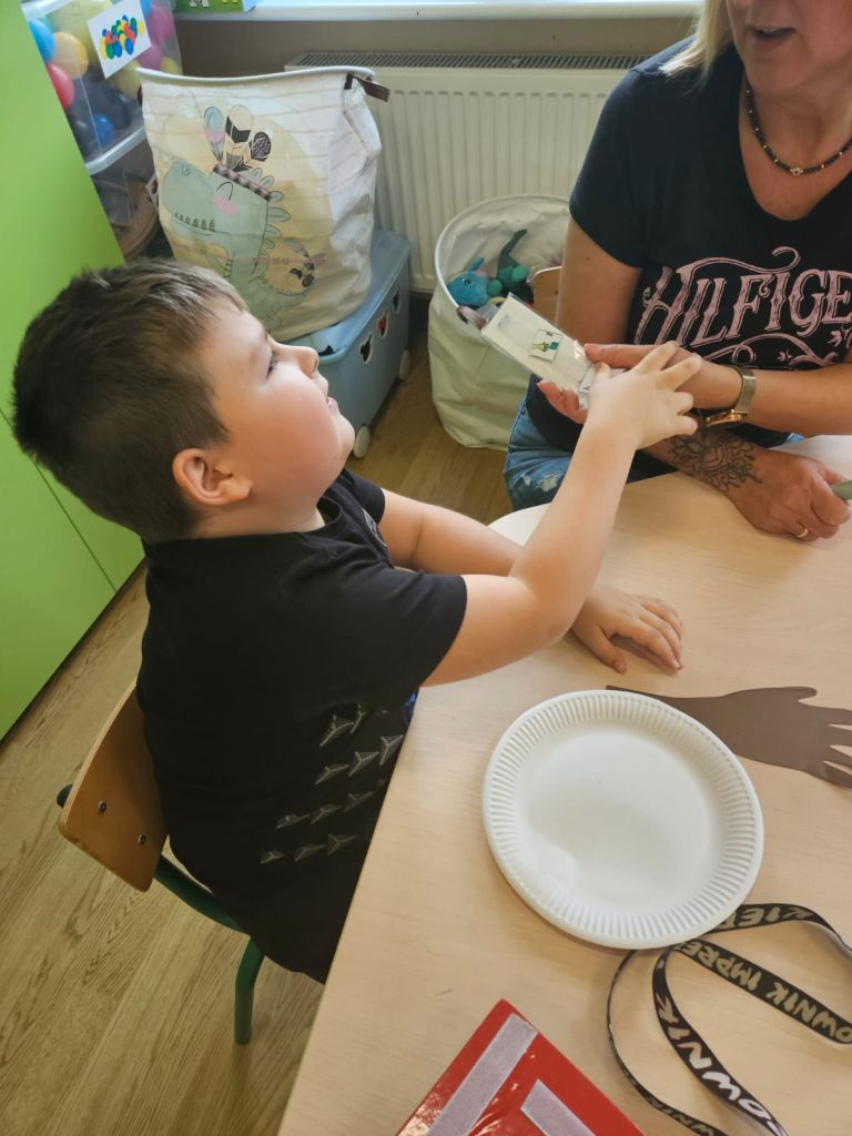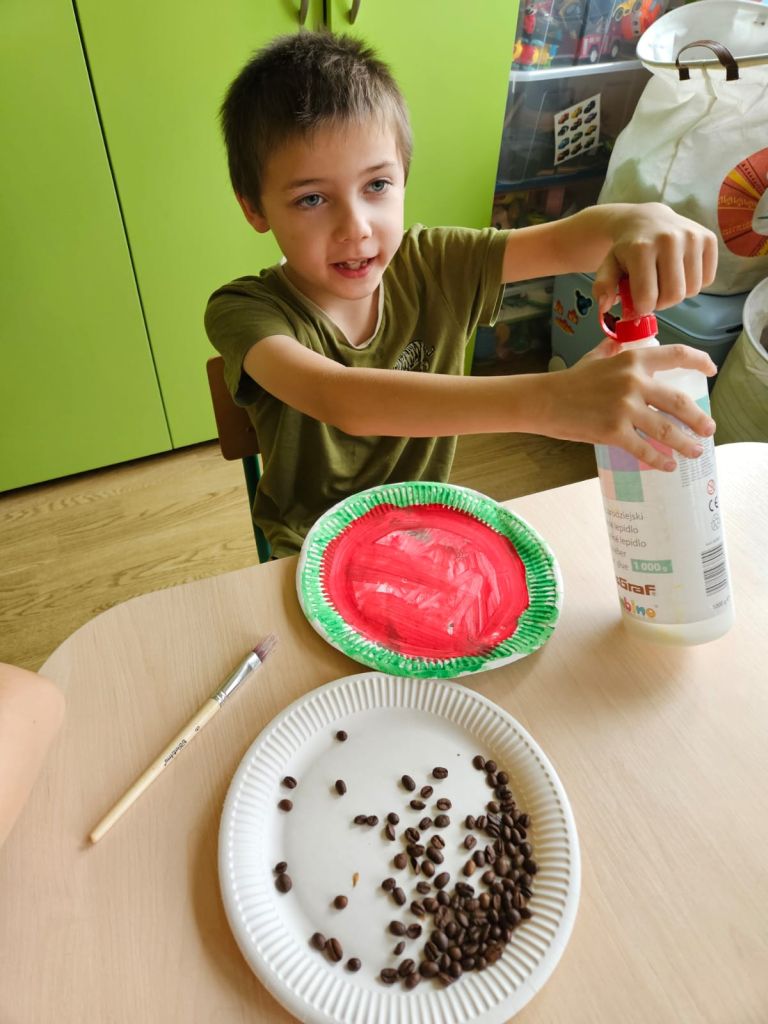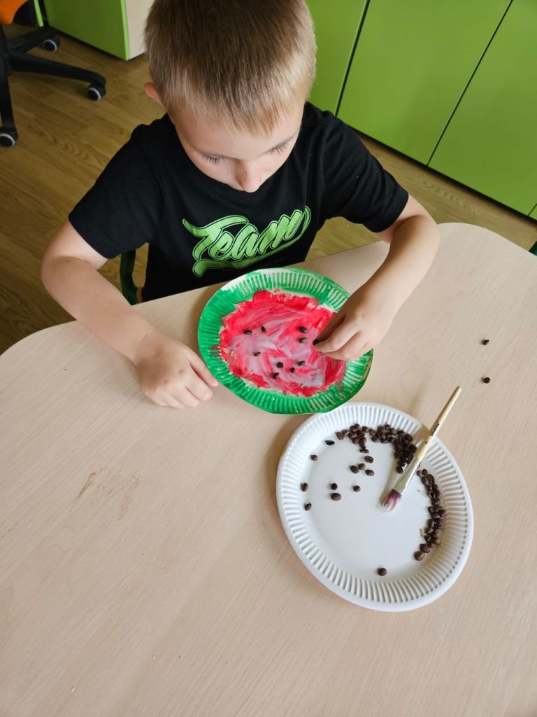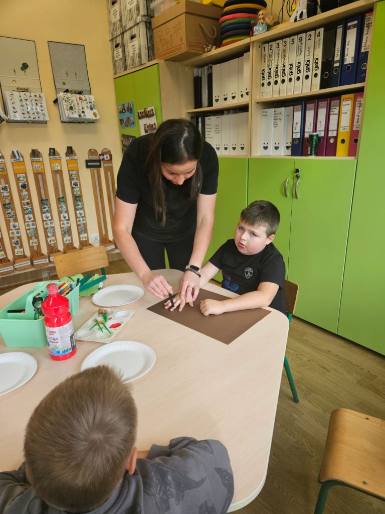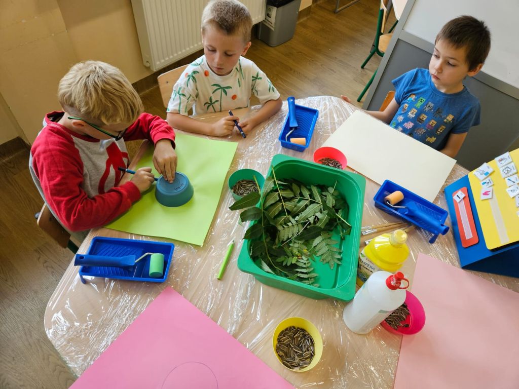 Podczas zajęć plastycznych tworzyliśmy prace o tematyce jesiennej – kolorowe liście, drzewa i owoce. Nie zabrakło także elementów sensoryki – dzieci miały możliwość doświadczać różnorodnych faktur, zapachów i kształtów, co sprawiło im dużo radości.