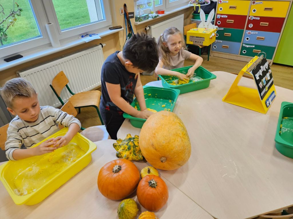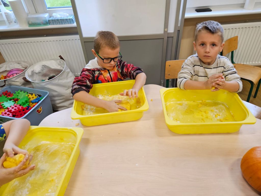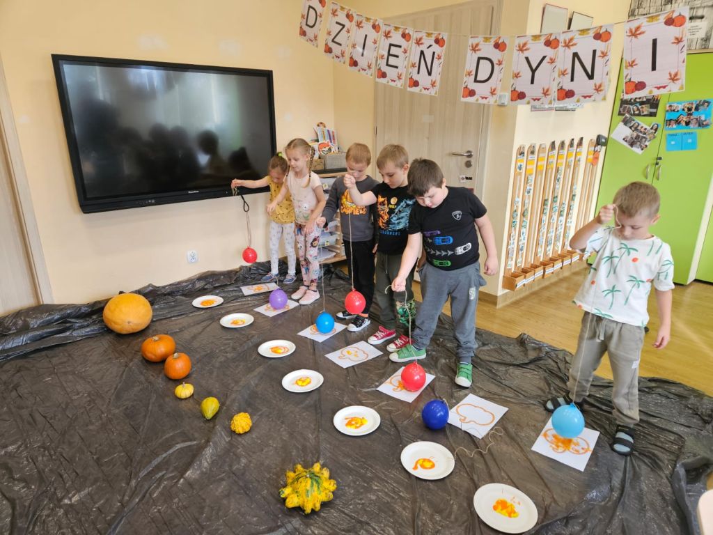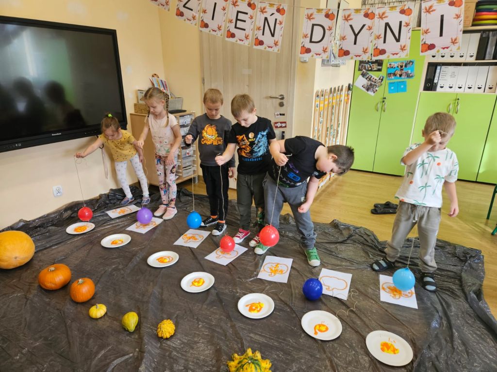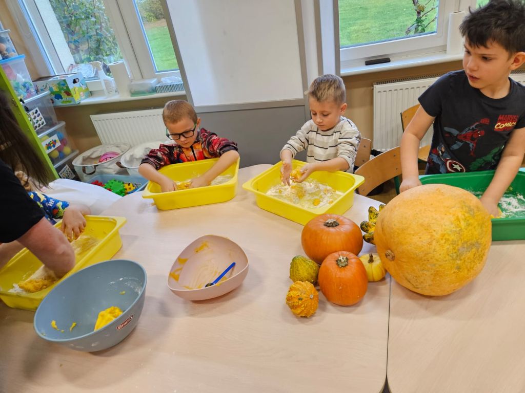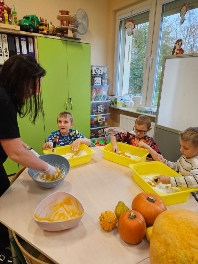 Słoneczka samodzielnie przygotowały pieczone ziemniaki, które potem z apetytem zjadały – nie zabrakło również pysznych frytek! Kolejną atrakcją był warsztat sensoryczny, podczas którego dzieci wykonały masę plastyczną z dyni, której faktura i zapach sprawiły im mnóstwo radości. Ponadto, dzieci malowały dyniowe obrazy za pomocą balonów, co stanowiło świetną okazję do rozwijania wyobraźni i zdolności manualnych.