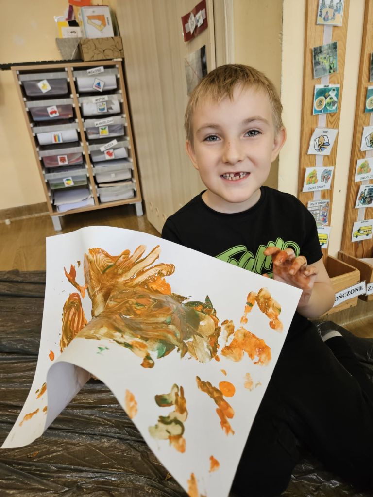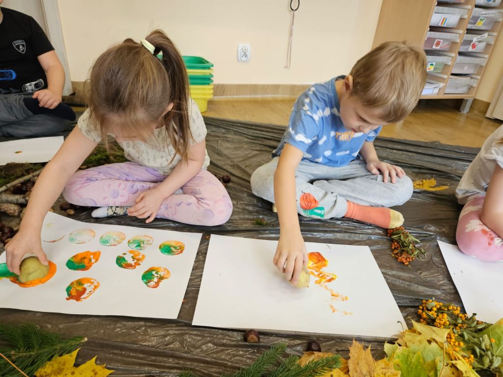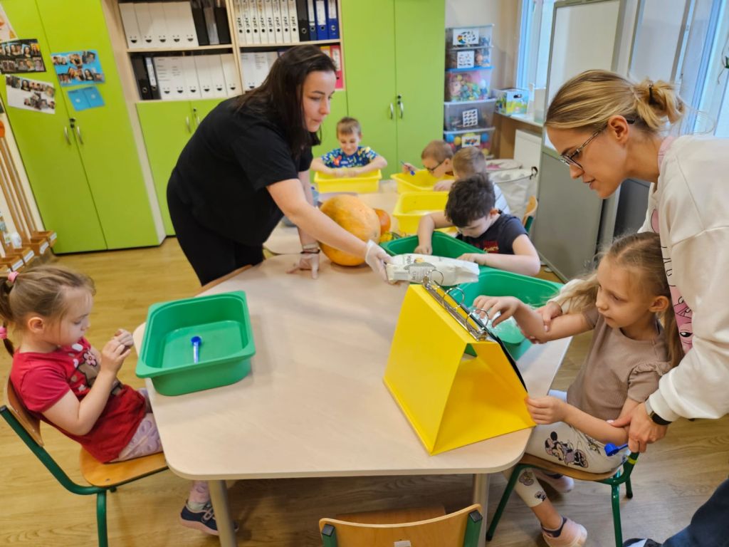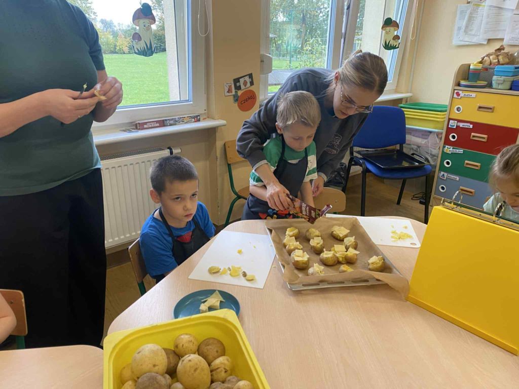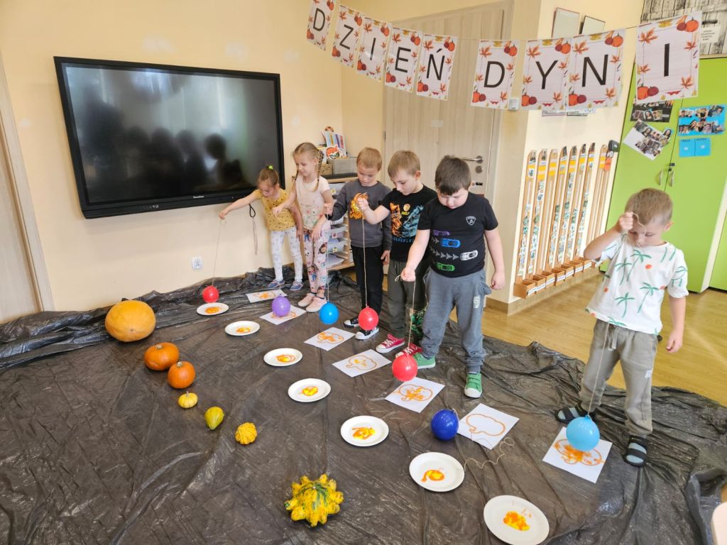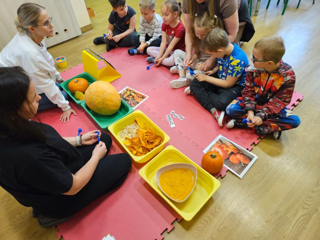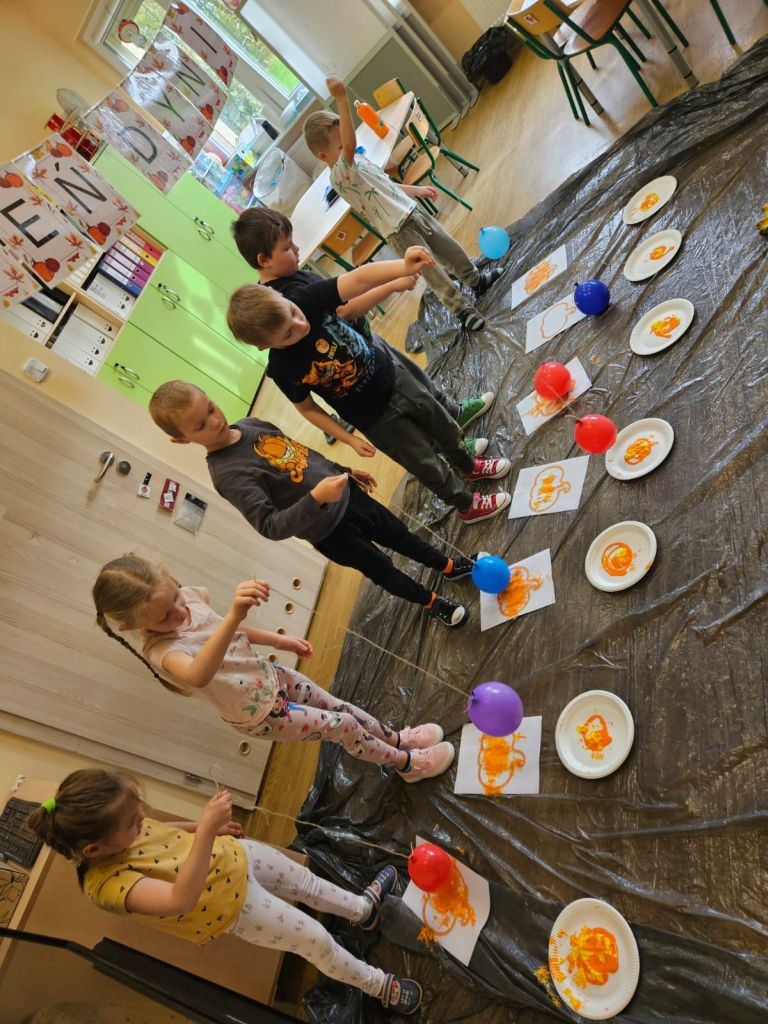 Słoneczka samodzielnie przygotowały pieczone ziemniaki, które potem z apetytem zjadały – nie zabrakło również pysznych frytek! Kolejną atrakcją był warsztat sensoryczny, podczas którego dzieci wykonały masę plastyczną z dyni, której faktura i zapach sprawiły im mnóstwo radości. Ponadto, dzieci malowały dyniowe obrazy za pomocą balonów, co stanowiło świetną okazję do rozwijania wyobraźni i zdolności manualnych.
