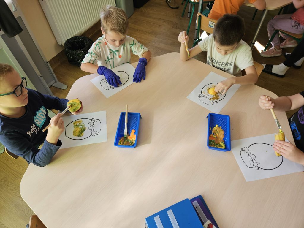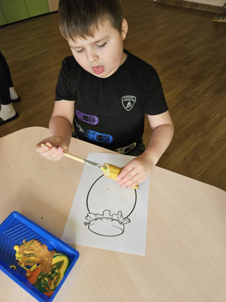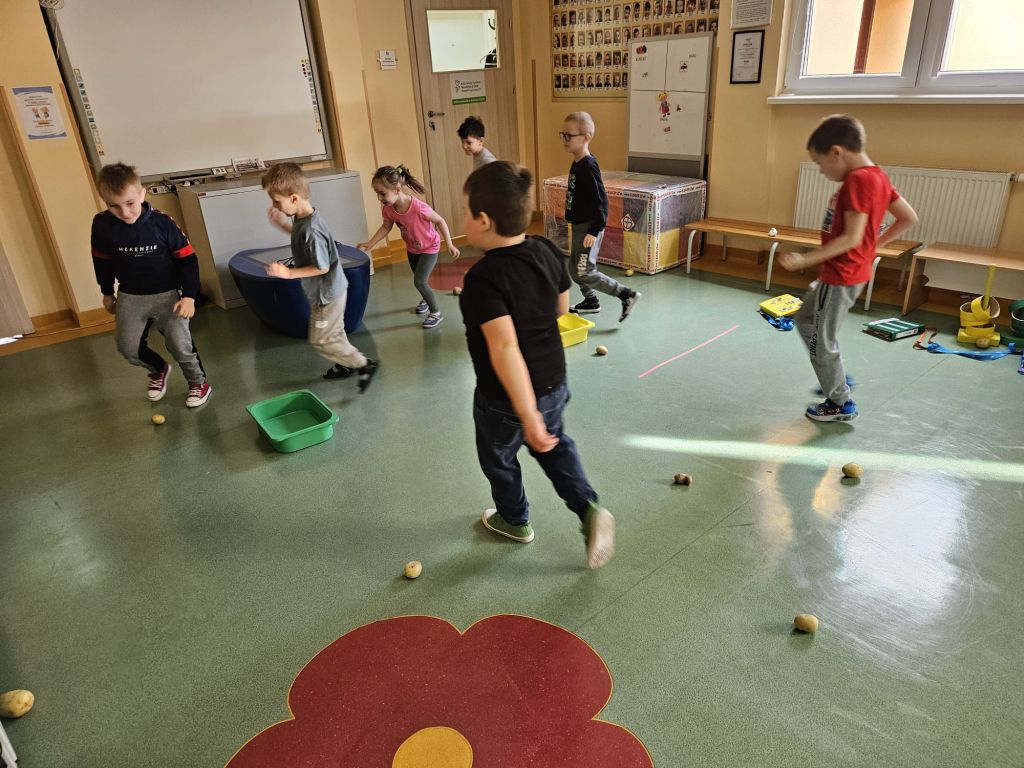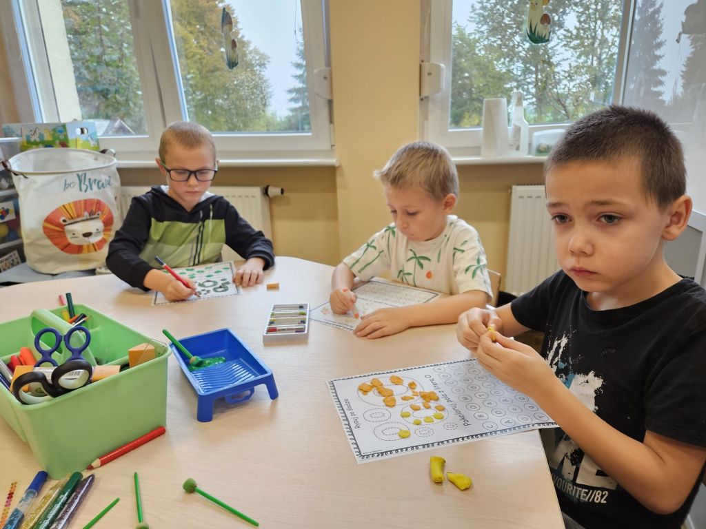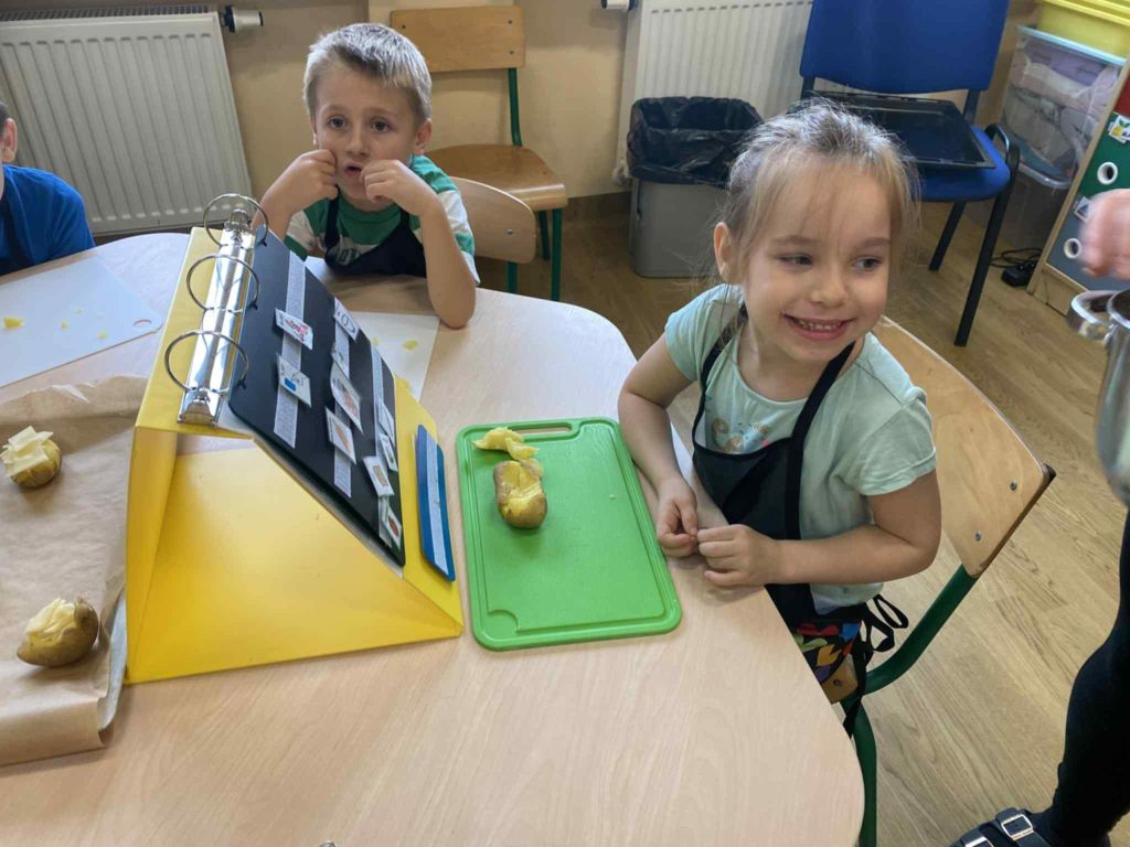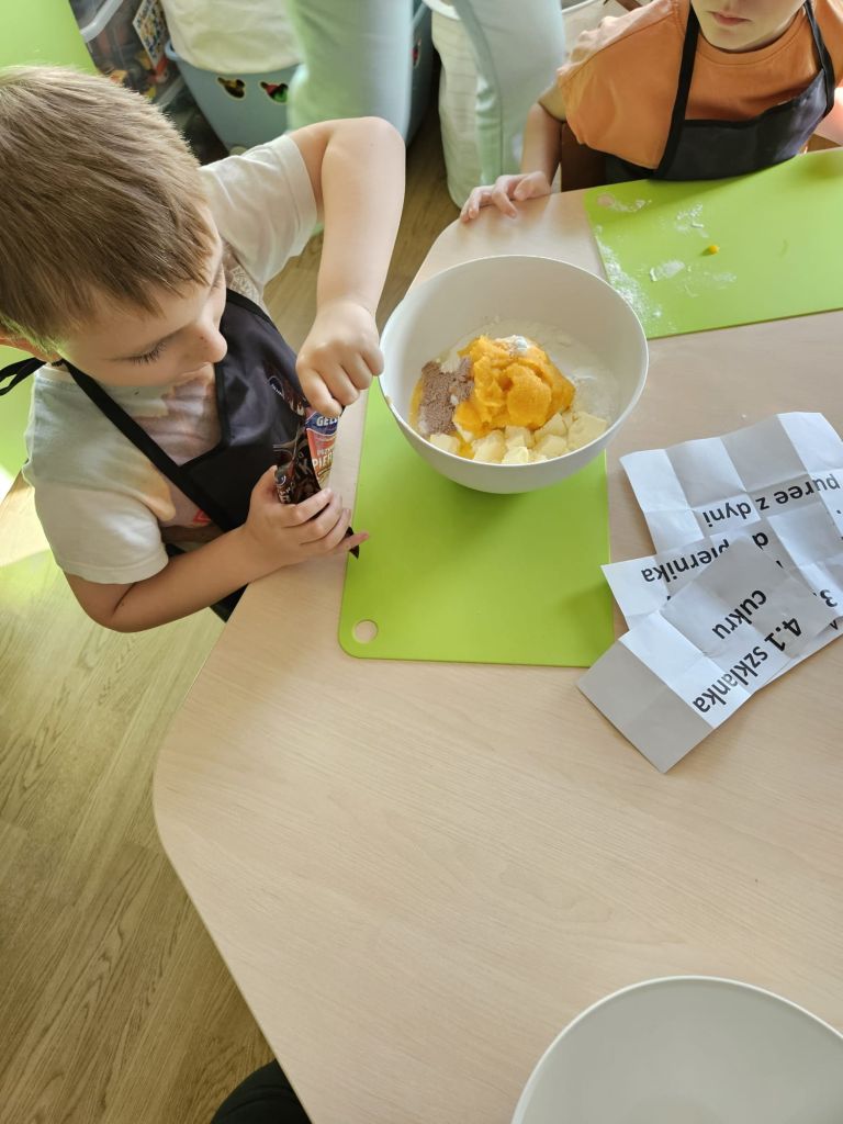 Słoneczka samodzielnie przygotowały pieczone ziemniaki, które potem z apetytem zjadały – nie zabrakło również pysznych frytek! Kolejną atrakcją był warsztat sensoryczny, podczas którego dzieci wykonały masę plastyczną z dyni, której faktura i zapach sprawiły im mnóstwo radości. Ponadto, dzieci malowały dyniowe obrazy za pomocą balonów, co stanowiło świetną okazję do rozwijania wyobraźni i zdolności manualnych.