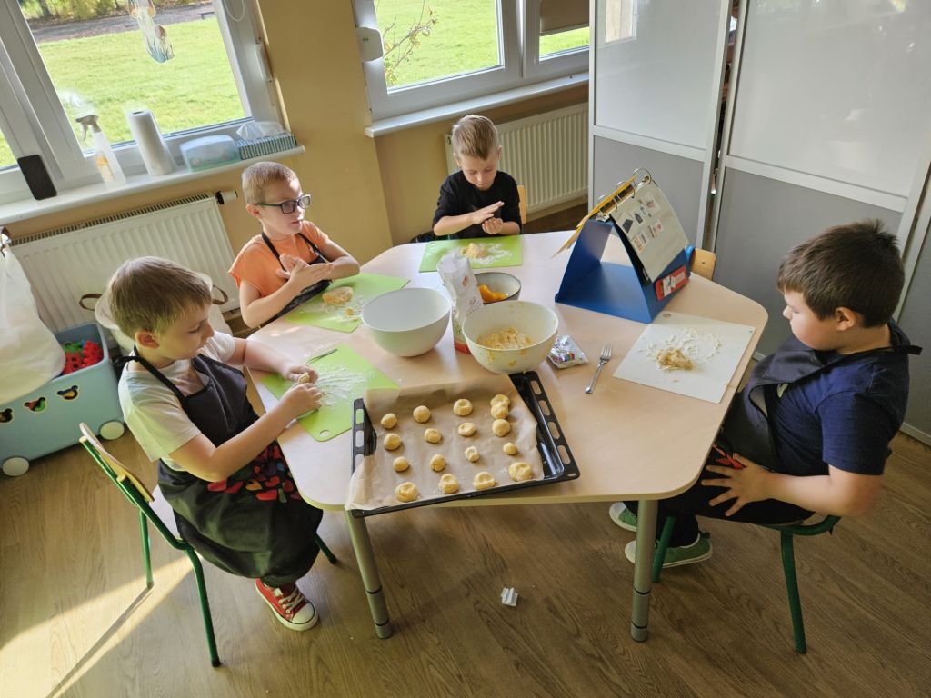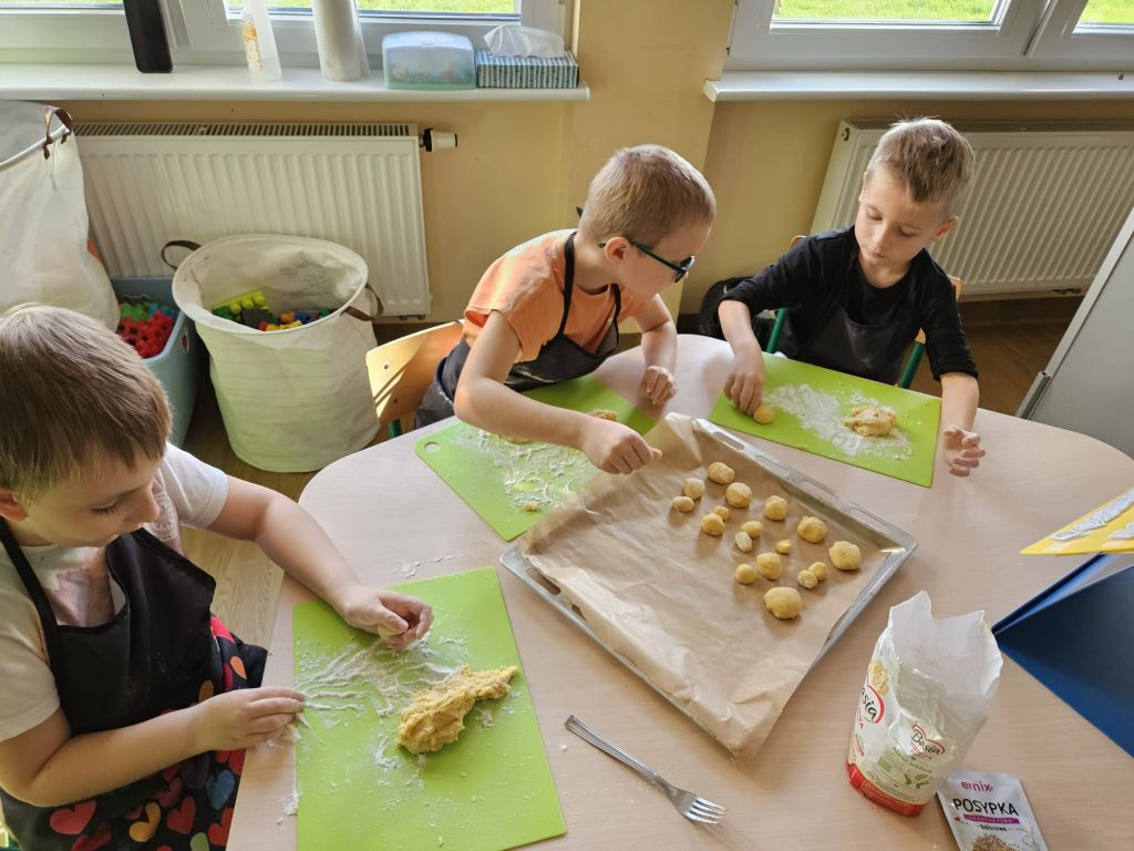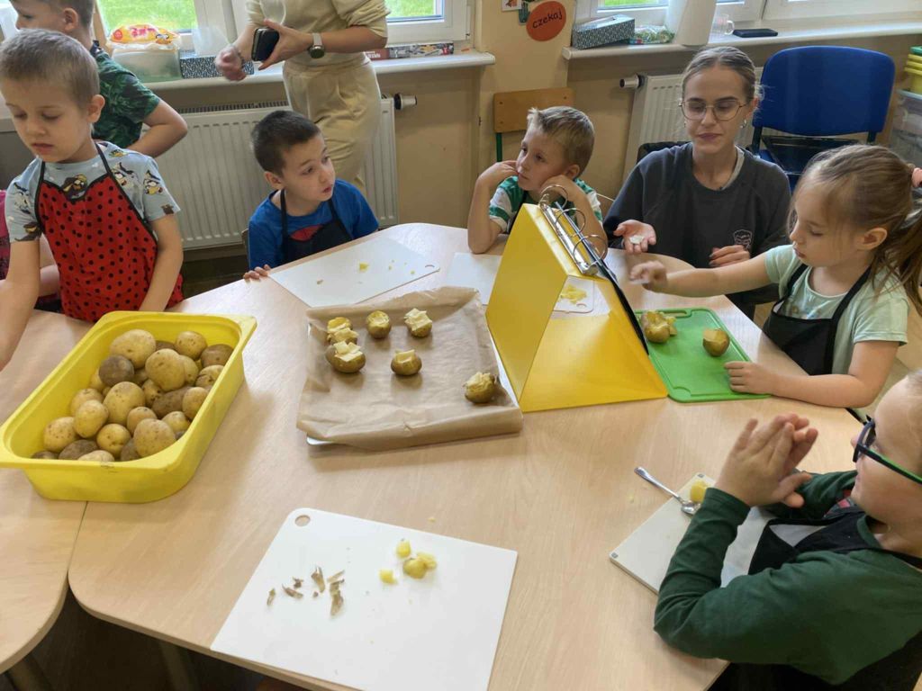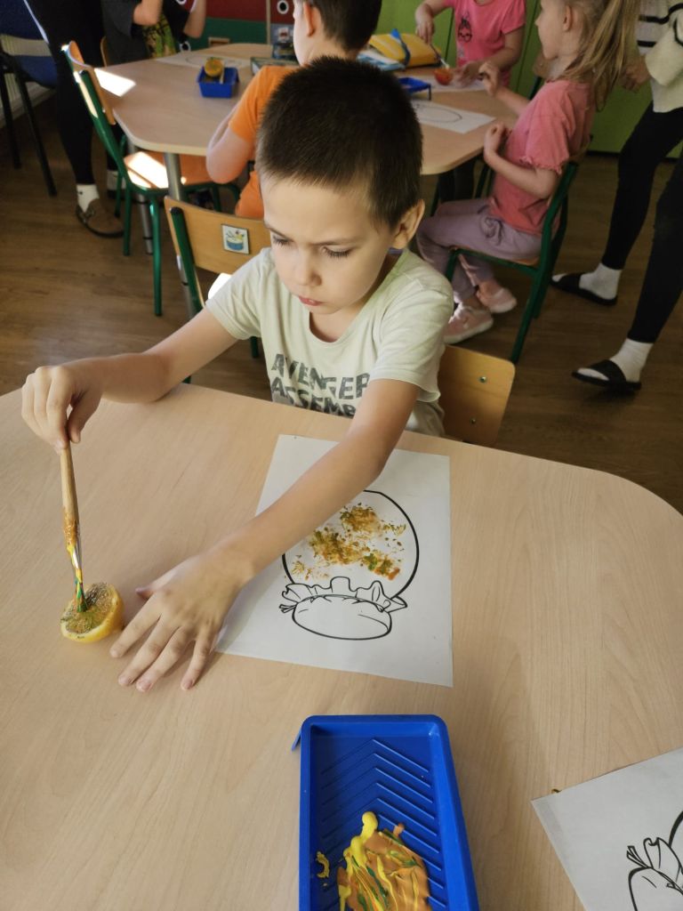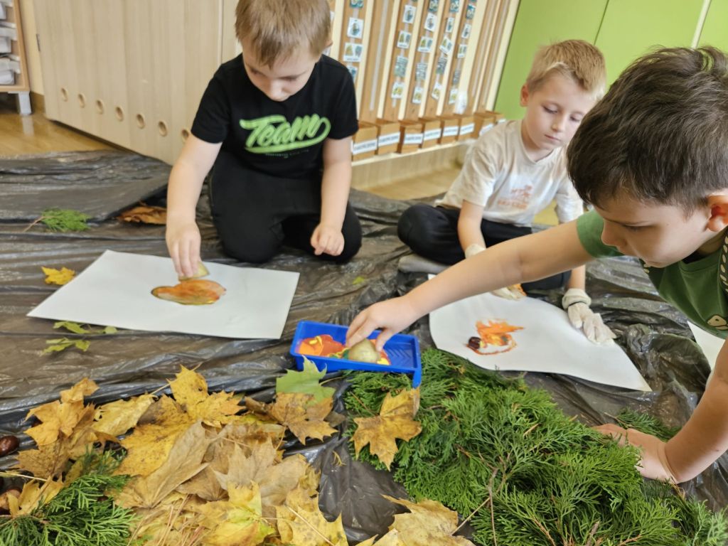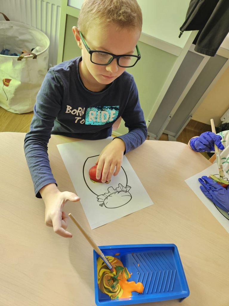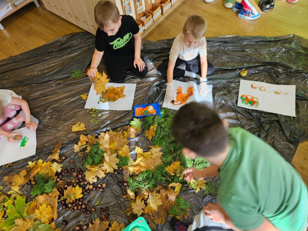 Słoneczka samodzielnie przygotowały pieczone ziemniaki, które potem z apetytem zjadały – nie zabrakło również pysznych frytek! Kolejną atrakcją był warsztat sensoryczny, podczas którego dzieci wykonały masę plastyczną z dyni, której faktura i zapach sprawiły im mnóstwo radości. Ponadto, dzieci malowały dyniowe obrazy za pomocą balonów, co stanowiło świetną okazję do rozwijania wyobraźni i zdolności manualnych.