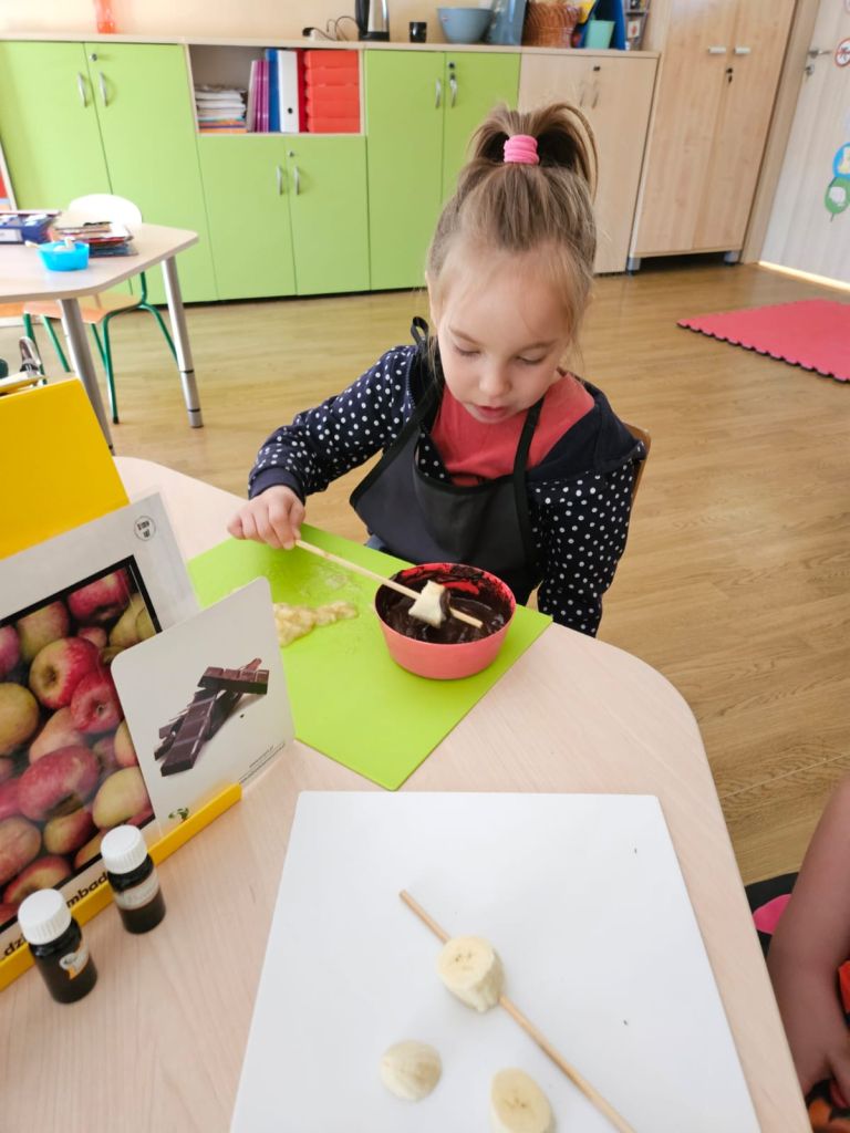 Następnego dnia sala przedszkolna wypełniła się zapachem roztopionej czekolady. Tym razem przygotowywaliśmy owoce w czekoladzie. Każdy przedszkolak mógł samodzielnie zanurzyć owoce w ciepłej polewie i udekorować je według własnego pomysłu. Efekt był pyszny.