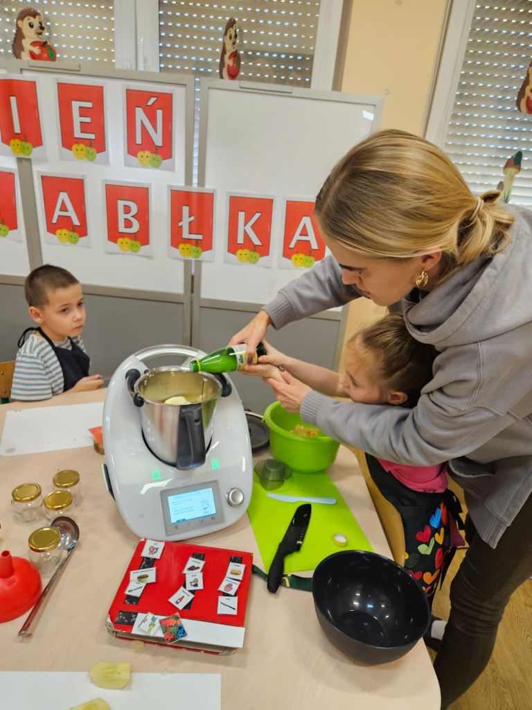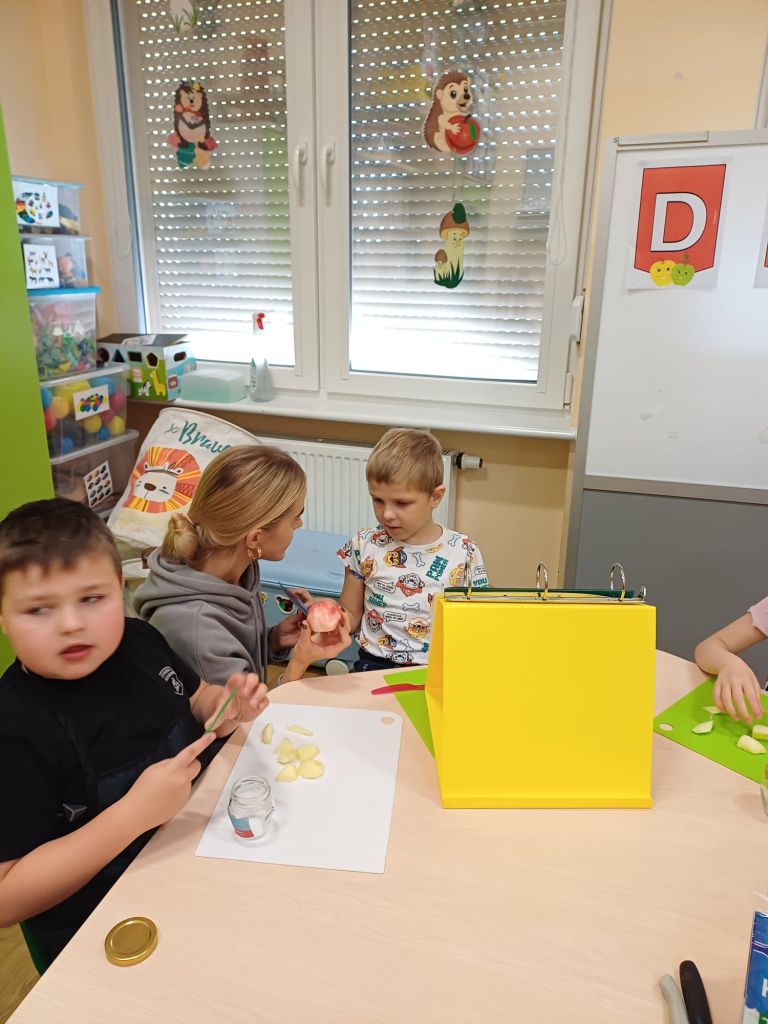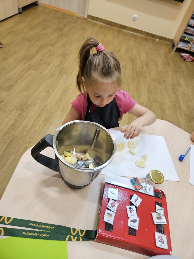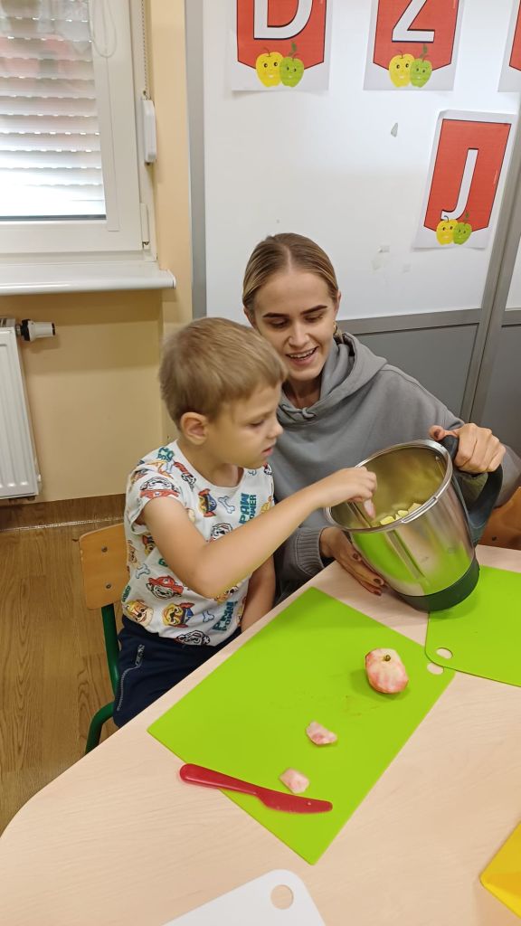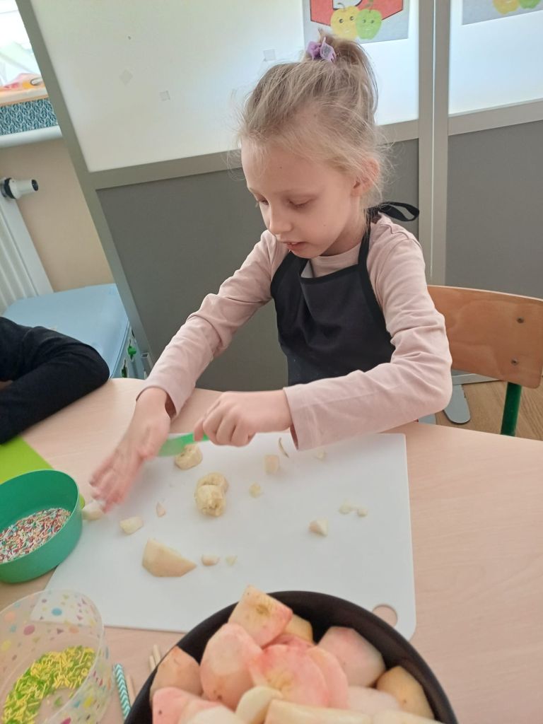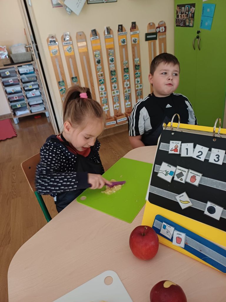 W tym tygodniu dzieci uczyły się kroić jabłka na kawałki. Była to doskonała okazja, by ćwiczyć cierpliwość, skupienie i sprawność dłoni. Pokrojone owoce zmieniły się w pyszny mus jabłkowy, który dzieci zabrały do domu, aby poczęstować rodzinę i wspólnie cieszyć się smakiem jesieni.
