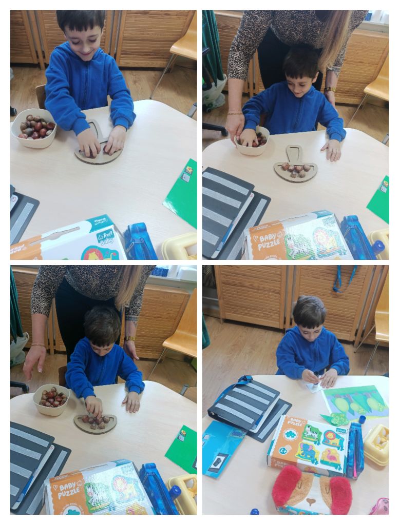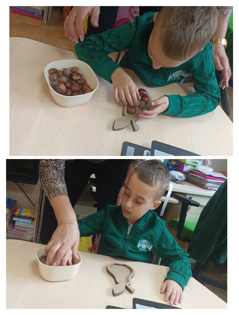 W grupie „Tygryski” Nadia, Hubert, Franek, Olek oraz Jasiu wykonywali różnorodne aktywności skupione na tematyce jesiennej, poszli na spacer w celu zbierania darów jesieni (kasztany, żołędzie), które później układali w sensorycznych kształtach (dynia, grzyb, parasol itp.).