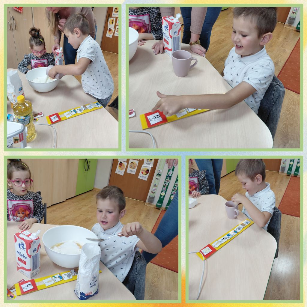 Pewnego październikowego dnia dzieci z grupy „Tygryski” osłodziły sobie dzień robiąc przepyszne gofry. Hubert, Jasiu oraz Nadia wrzucali składniki do miski korzystając z mini planu aktywności.