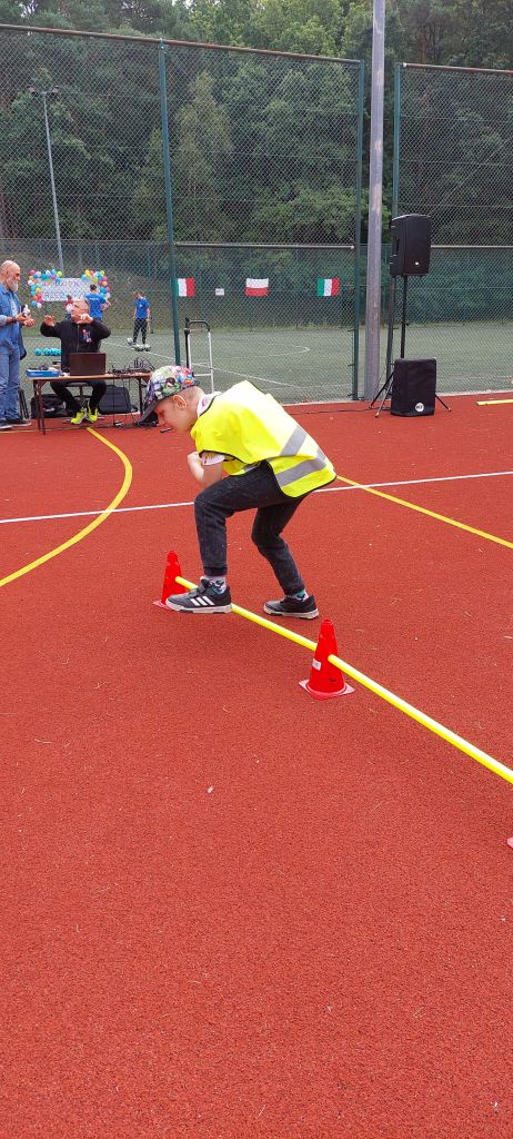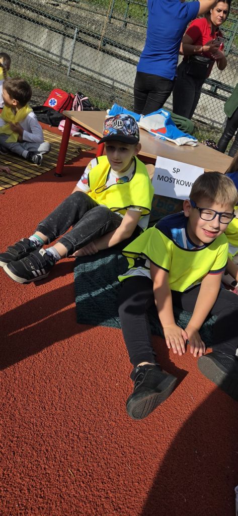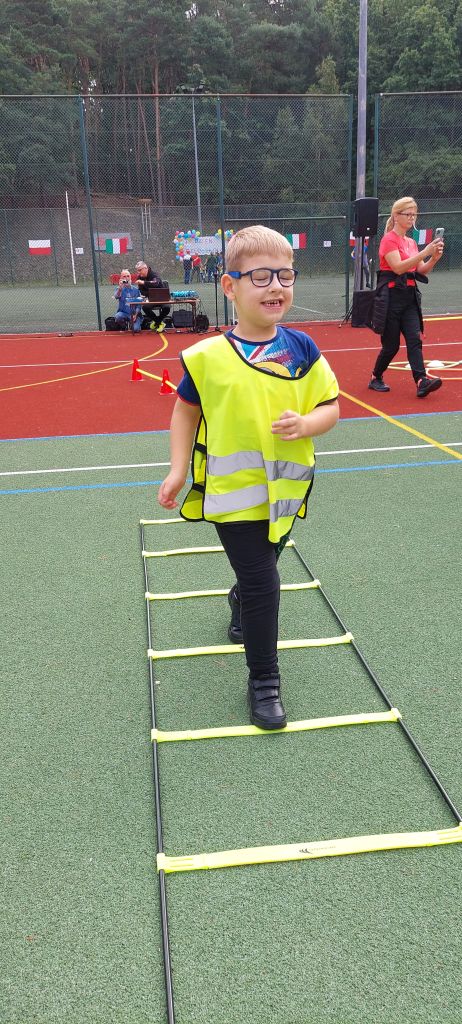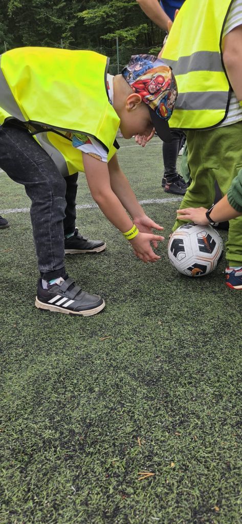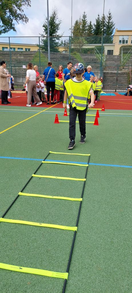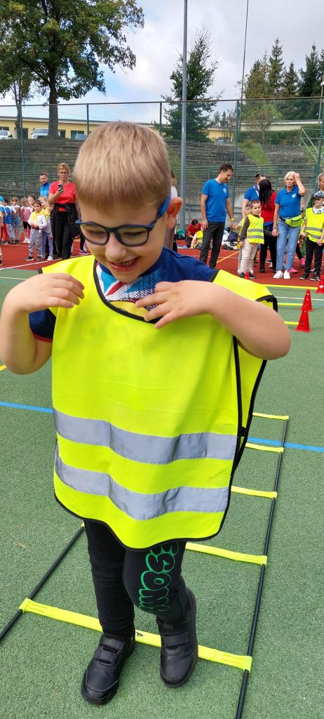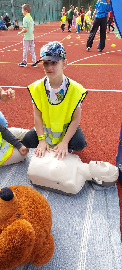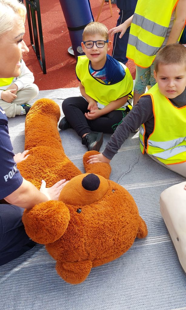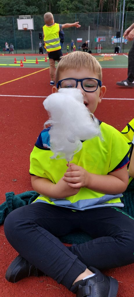 Następnie dzieci z radością pokonywały różnorodne tory przeszkód i wykonywały ciekawe zadania. Gościem specjalnym była policja, która uczyła i pokazywała jak udzielać pierwszej pomocy. Na wszystkich czekały zdrowe przekąski z warzyw i owoców, a także popcorn, wata cukrowa i pyszne kiełbaski. To był dzień pełen ruchu, śmiechu i niezapomnianych wrażeń.