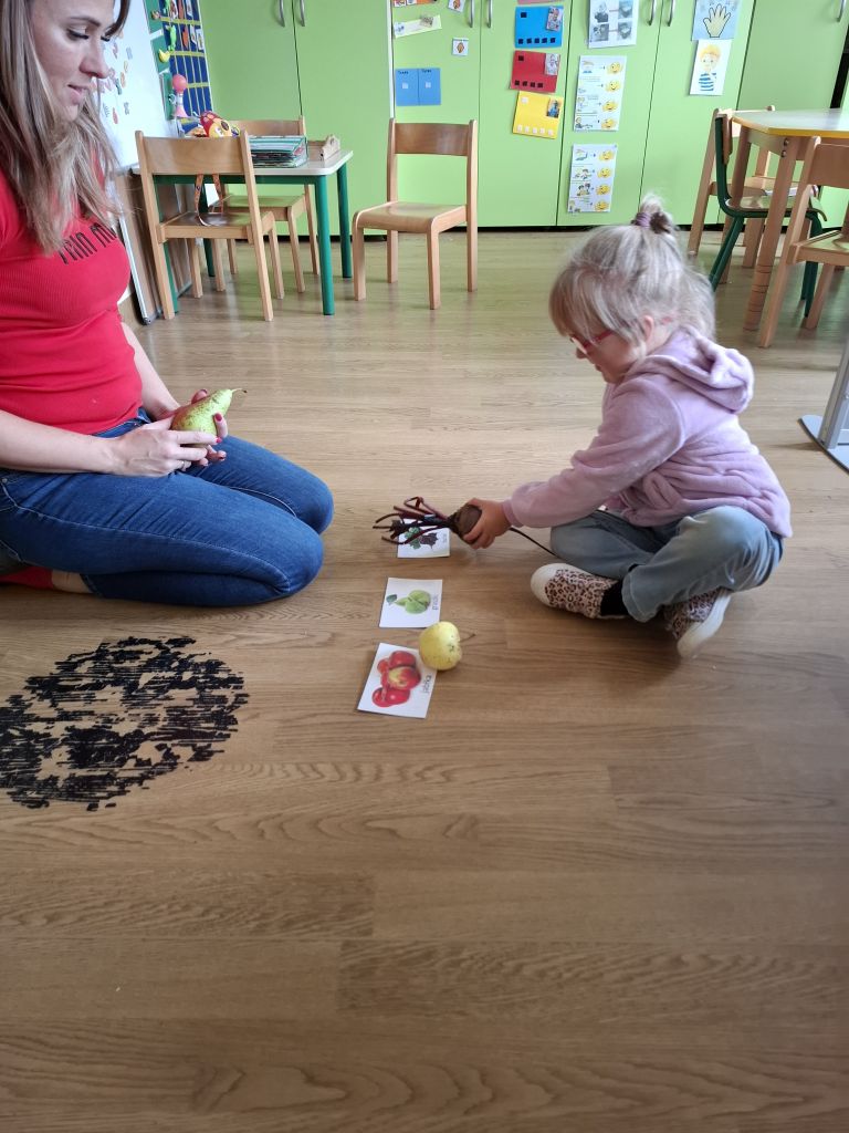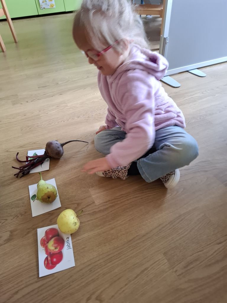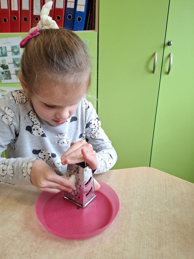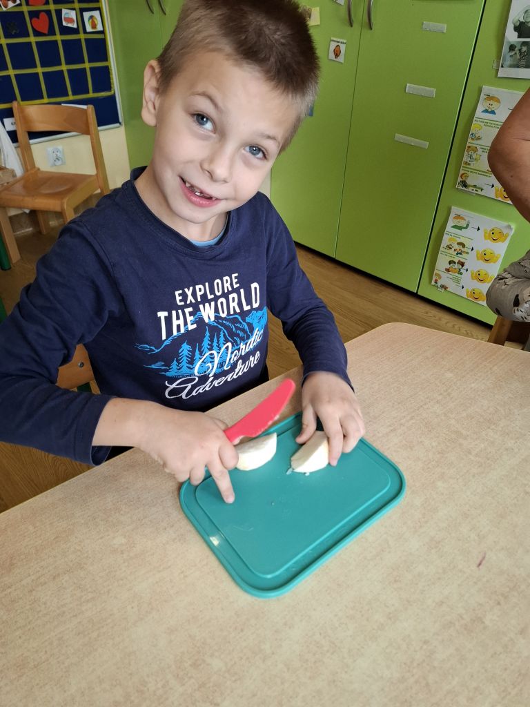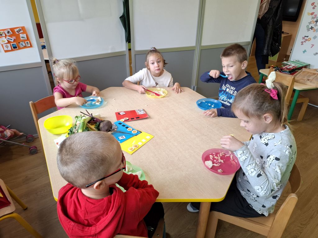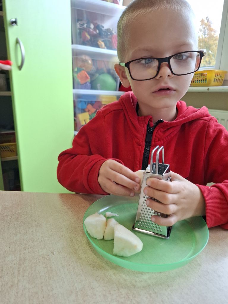 Mogły zapoznać się z wyglądem i nazwami wybranych warzyw, określić ich kolor i kształt, powąchać, jaki mają zapach. Oprócz zabaw sensorycznych odbyły się warsztaty kulinarne, na które nasze przedszkolaki wybrały sobie popularny owoc czyli jabłko. Najpierw kroiły owoc na kawałki, następnie tarły na wiórki i degustowały.