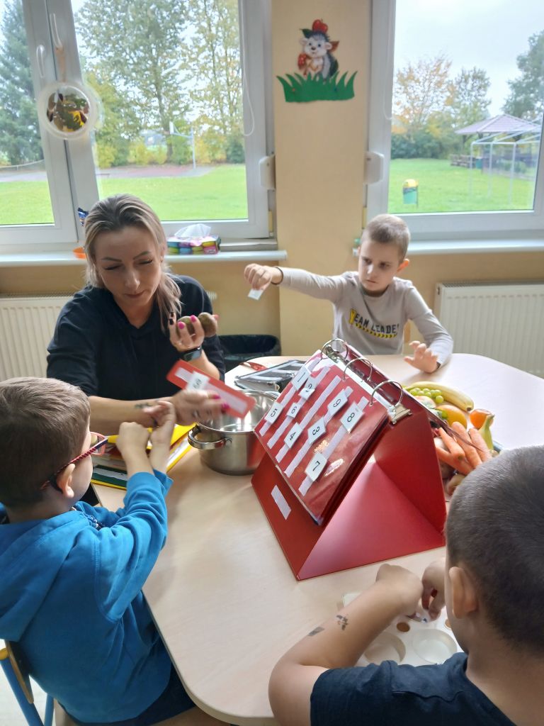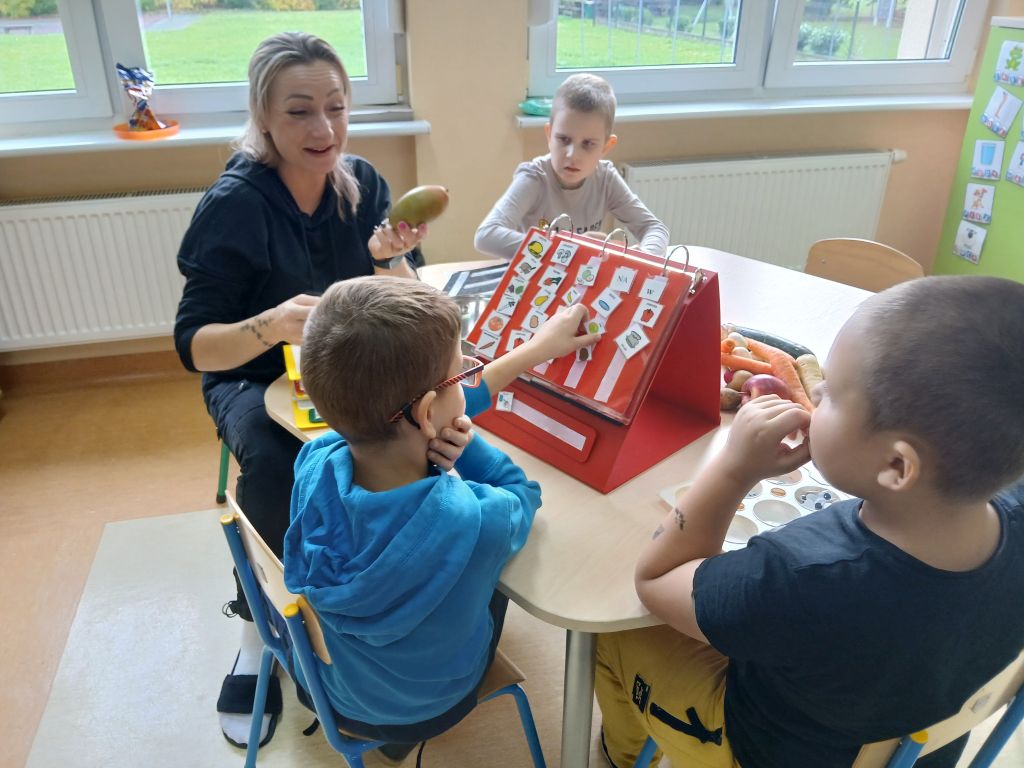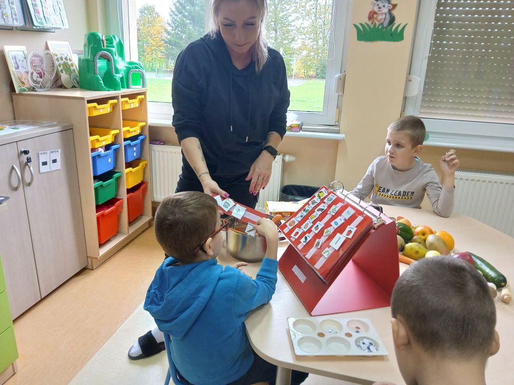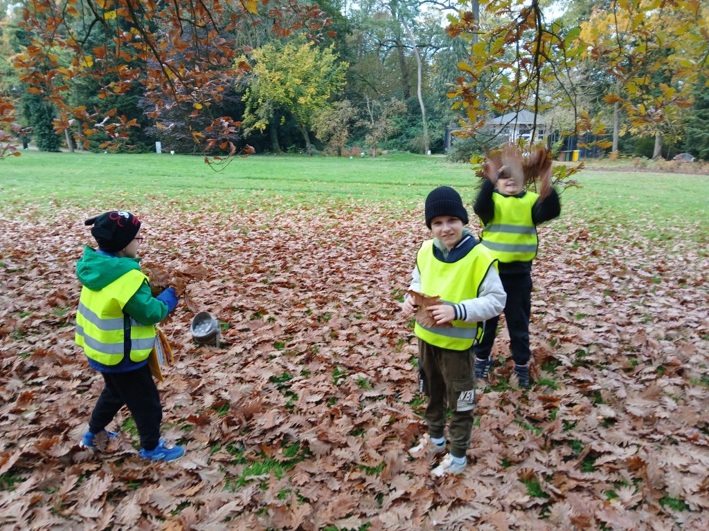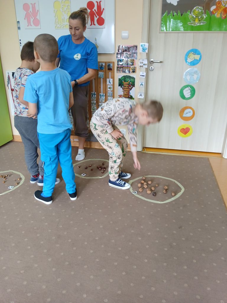 Dzieci uczestniczyły w różnorodnych jesiennych aktywnościach. Podczas zabaw poznawały i wykorzystywały jesienne atrybuty – kolorowe liście, kasztany i żołędzie.