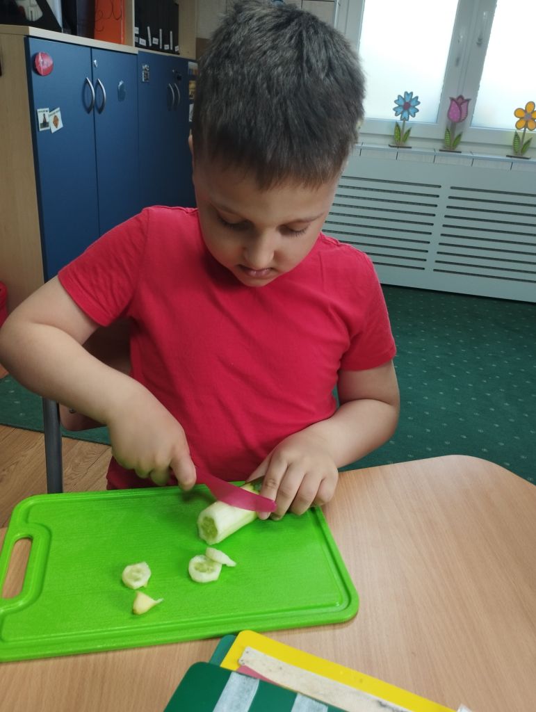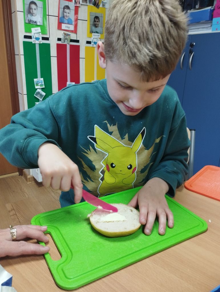 Dzieci z zaangażowaniem nazywały warzywa , smarowały masłem bułki i wybierały warzywa na kanapki, które zjadały z apetytem.
