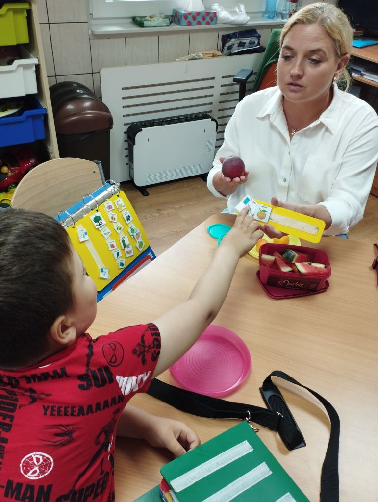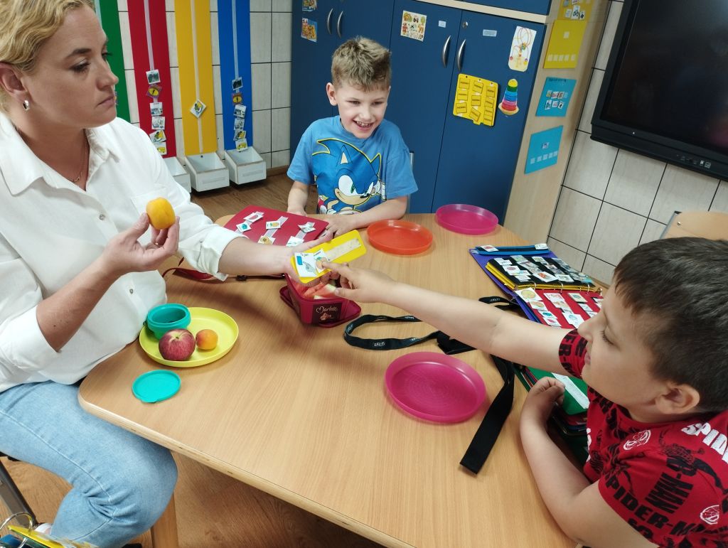 Dzieci poznawały różne owoce utrwalały ich nazwy i próbowały jak smakują, z apetytem zajadały te słodsze. Większość pokochała arbuza i truskawki, borówki, brzoskwinie i morele nie przypadły im do gustu. Było zdrowo ,smacznie i kolorowo.