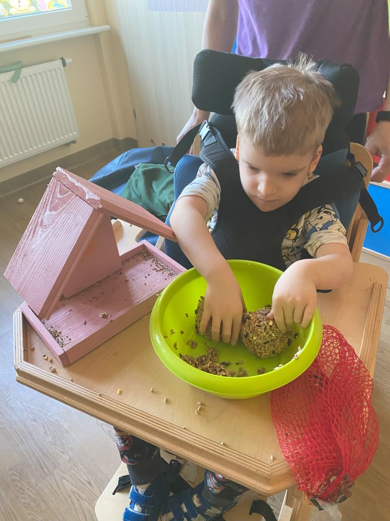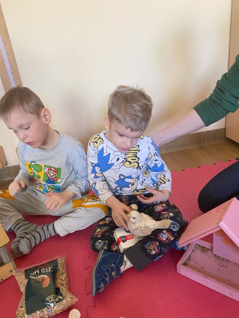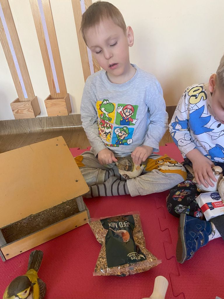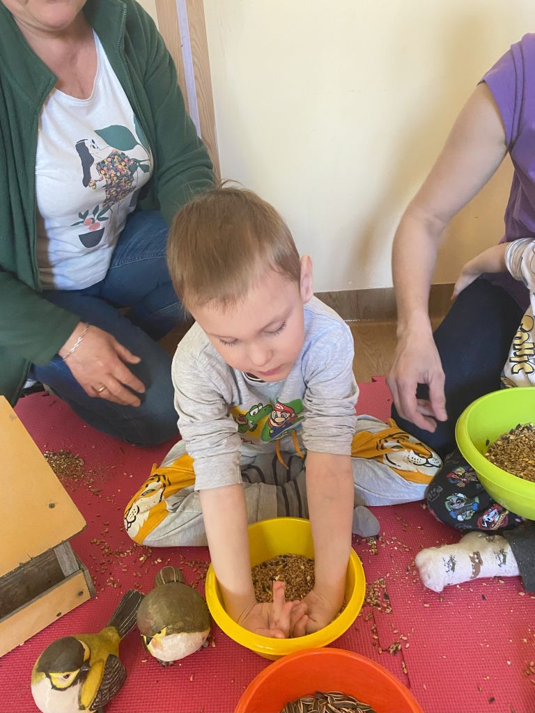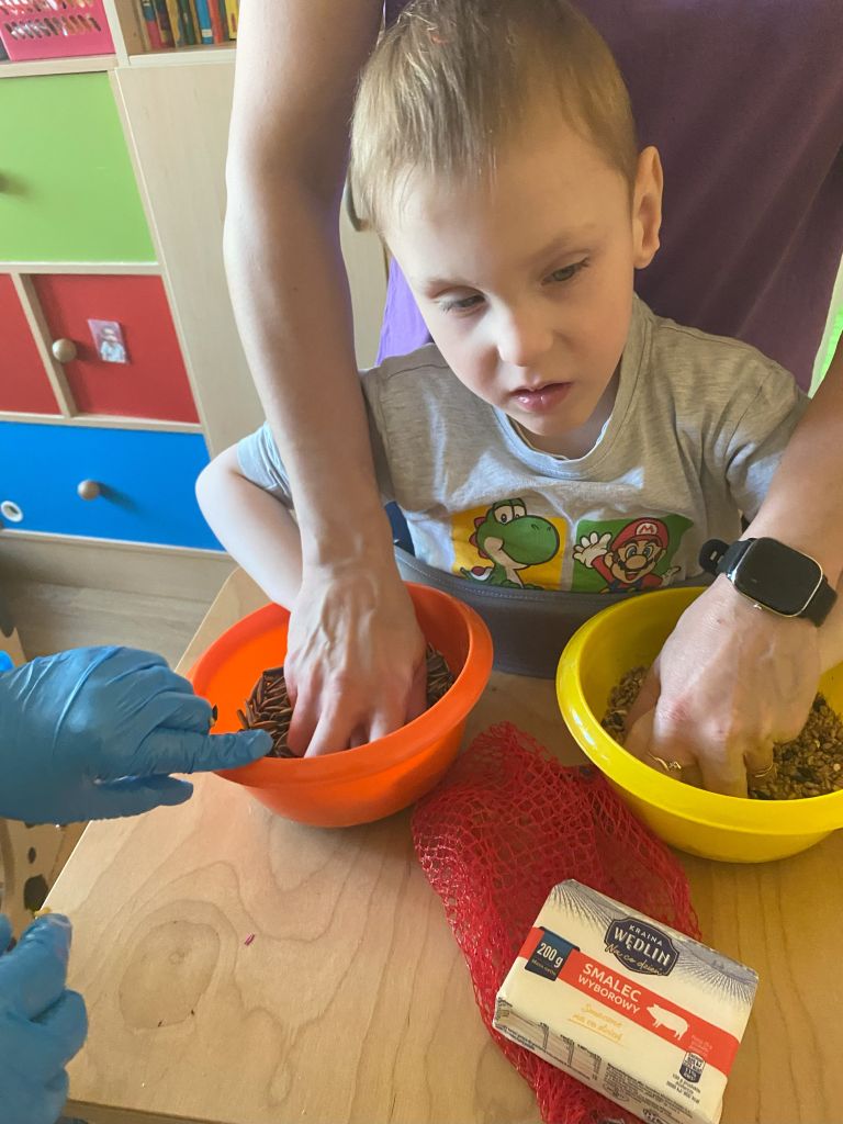 My Krasnale o ptakach pamiętamy i je zawsze dokarmiamy. Przygotowanie ptasich smakołyków było dobrym ćwiczeniem rąk, oraz świetną zabawą sensoryczną z różnymi fakturami. Nasi skrzydlaci przyjaciele nie odlecą już z pustymi brzuszkami, a mroźna zima nie będzie dla nich straszna.