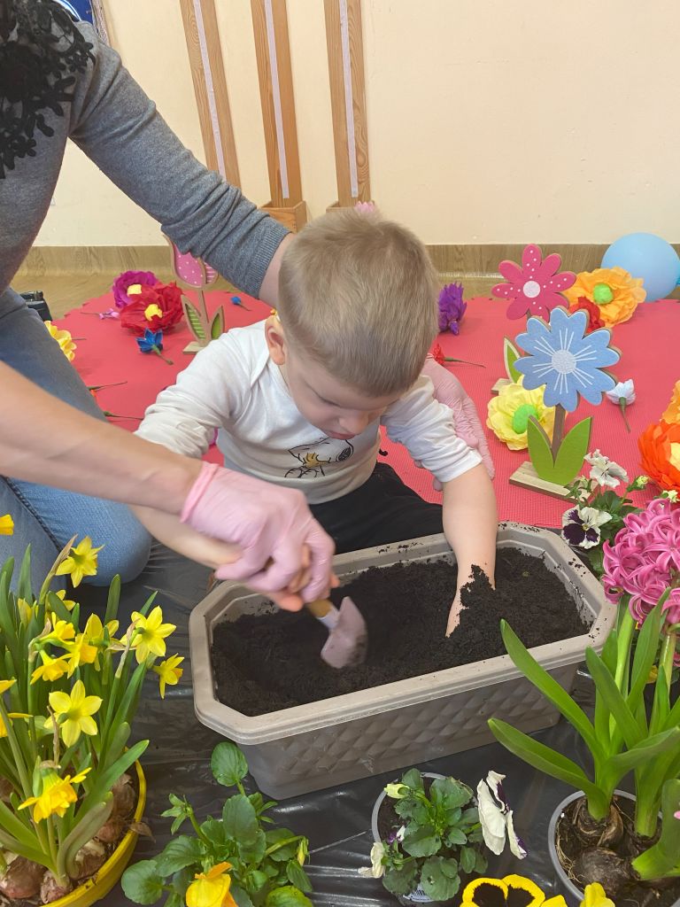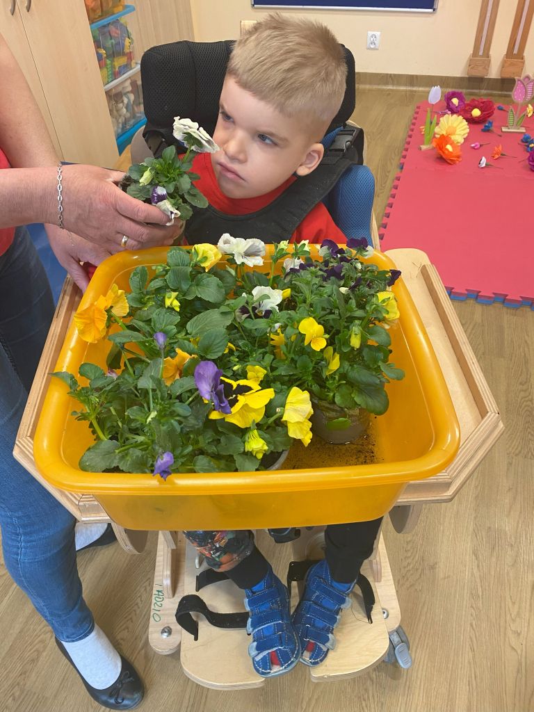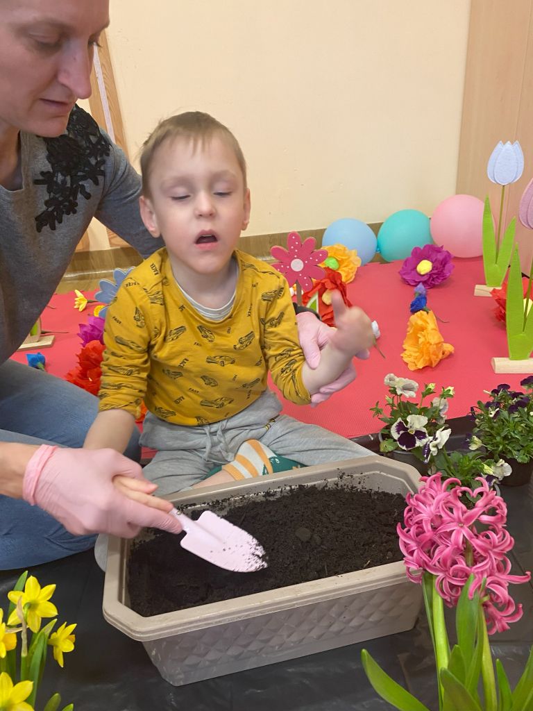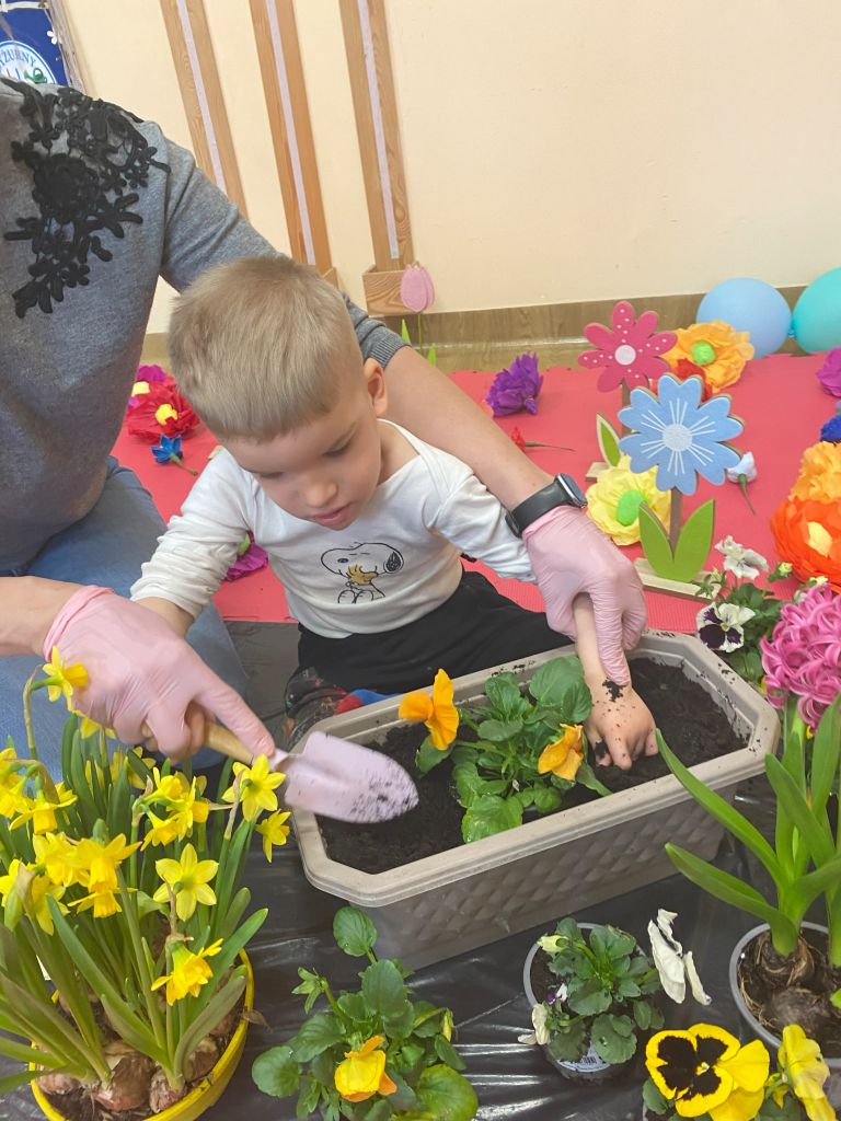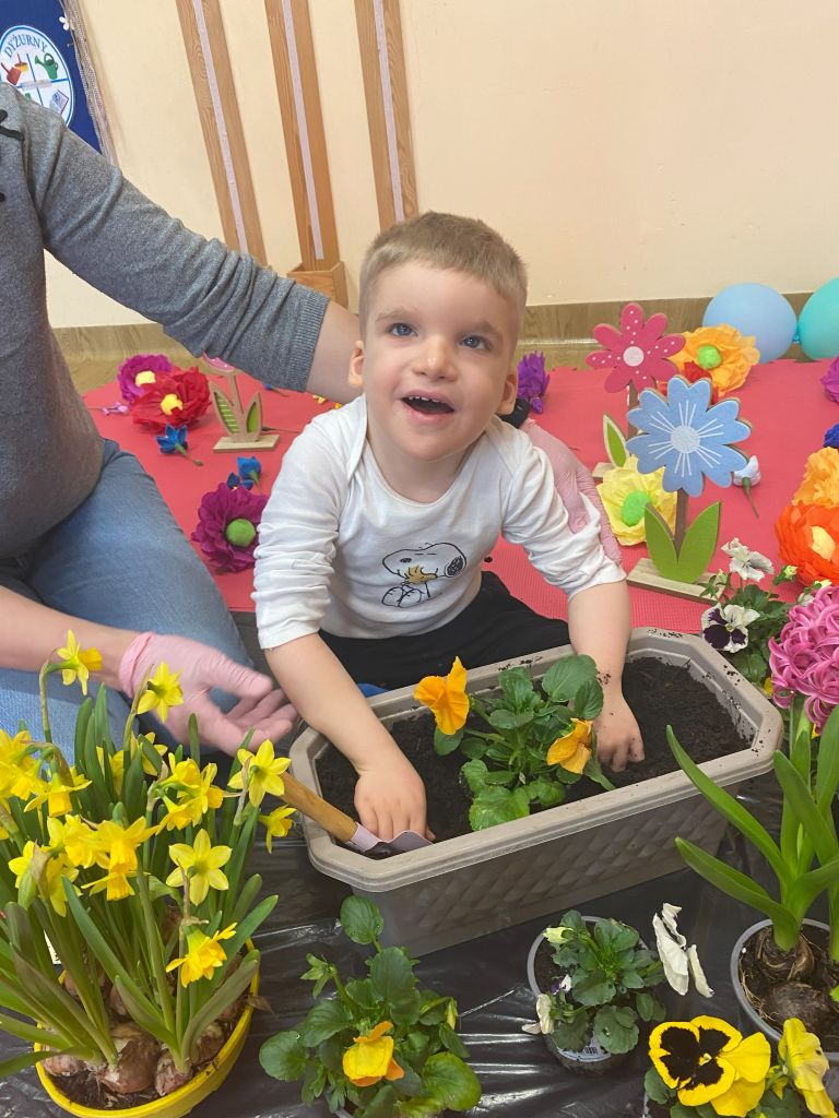 Wraz ze zbliżającym się wkrótce nadejściem wiosny Krasnale włączyły w prace ogrodnicze, dotykaliśmy, uklepywaliśmy ziemię i sadziliśmy z pomocą pani kolorowe wiosenne kwiaty. Nasze parapety wypełniły donice żonkilami, hiacyntami