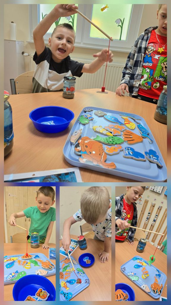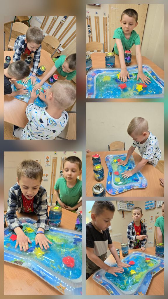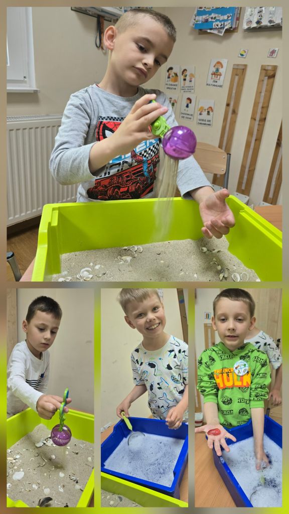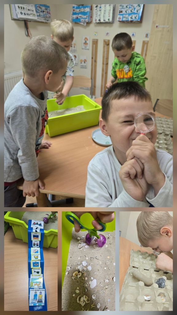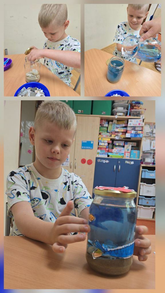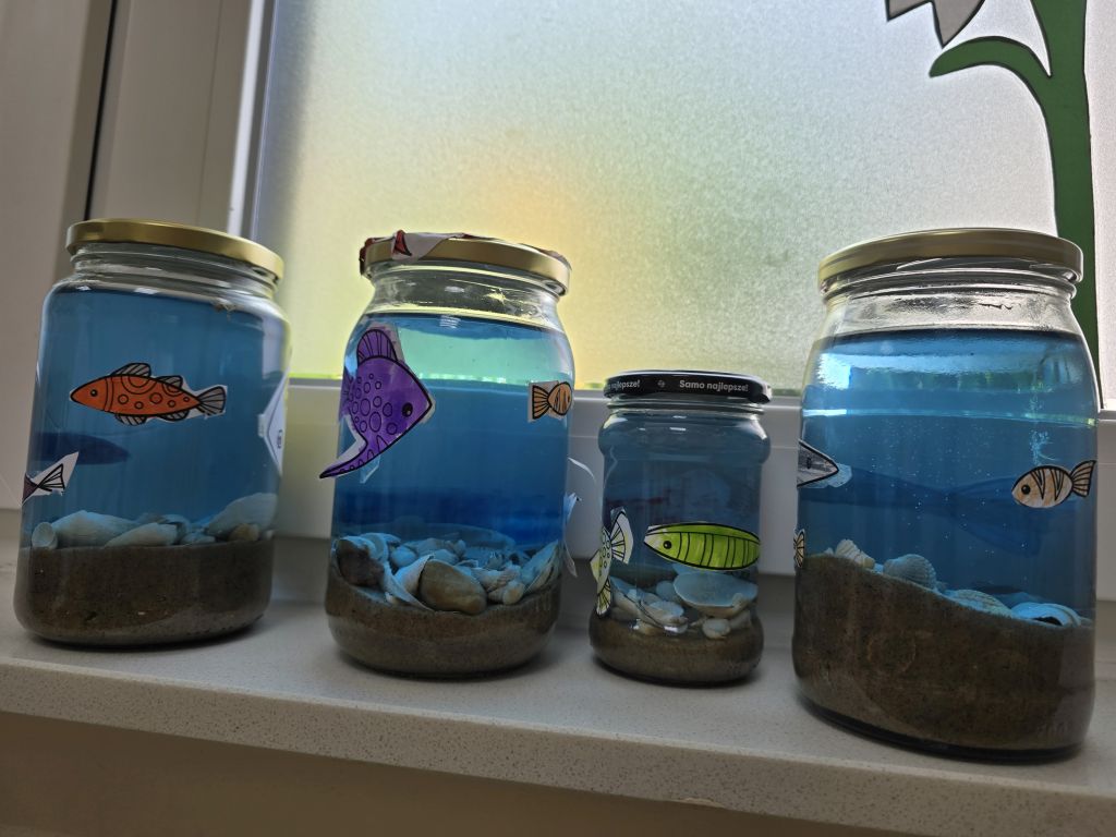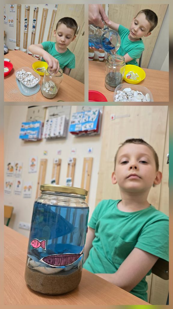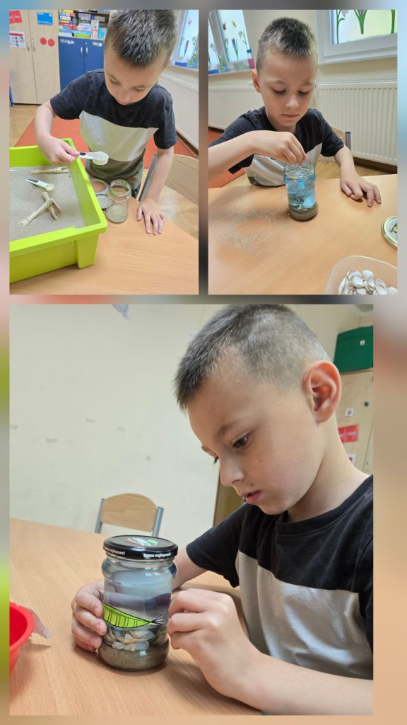 Dzieci rozmawiały o tym, co można znaleźć nad morzem i pod jego powierzchnią, dzieliły się swoimi wspomnieniami z wakacji, a także wspólnie odkrywały „skarby” ukryte w piasku i wodzie. Następnie stworzyły własne morze w słoiku – z piaskiem, muszelkami, wodą i kolorowymi rybkami, które wcześniej samodzielnie namalowały.