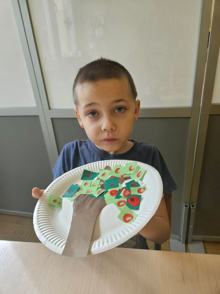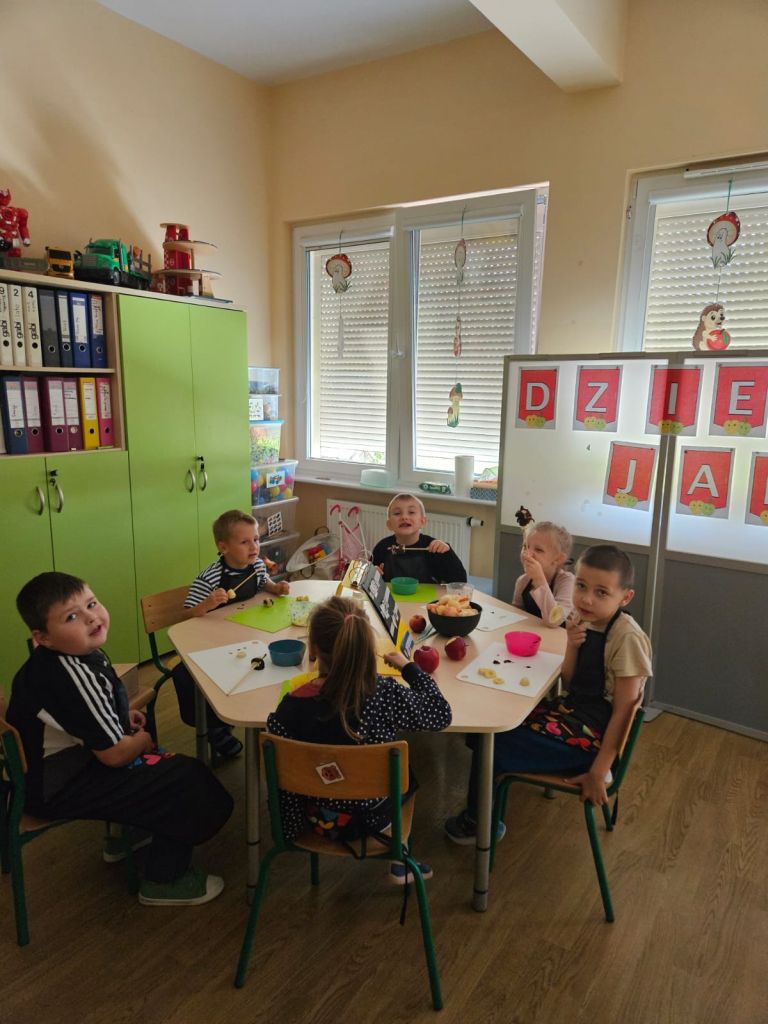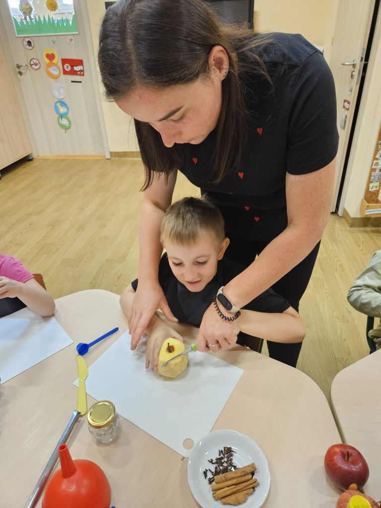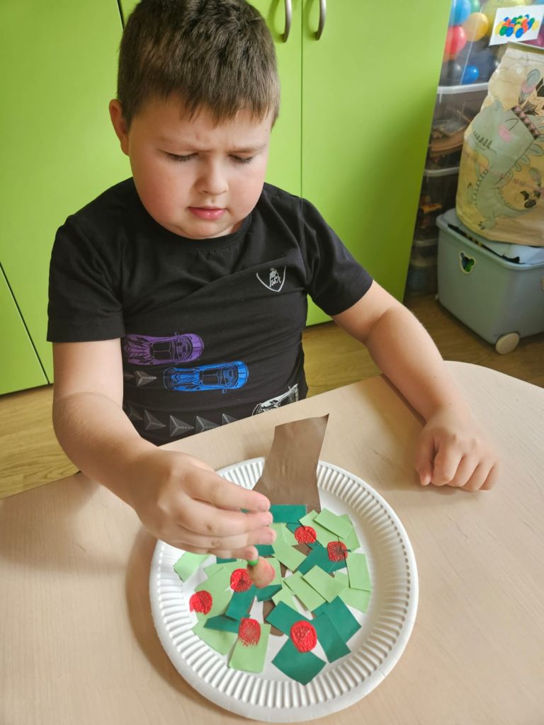 Podczas zajęć plastycznych tworzyliśmy prace o tematyce jesiennej – kolorowe liście, drzewa i owoce. Nie zabrakło także elementów sensoryki – dzieci miały możliwość doświadczać różnorodnych faktur, zapachów i kształtów, co sprawiło im dużo radości.