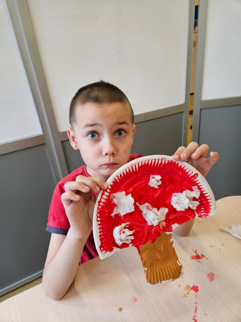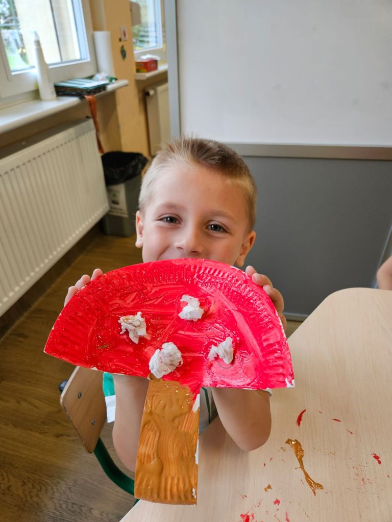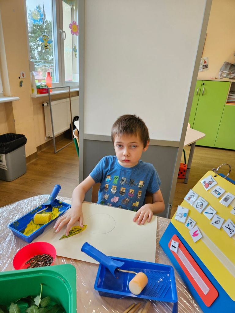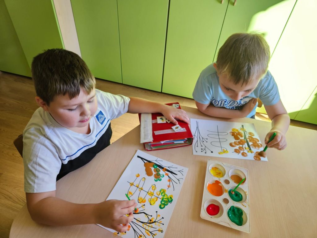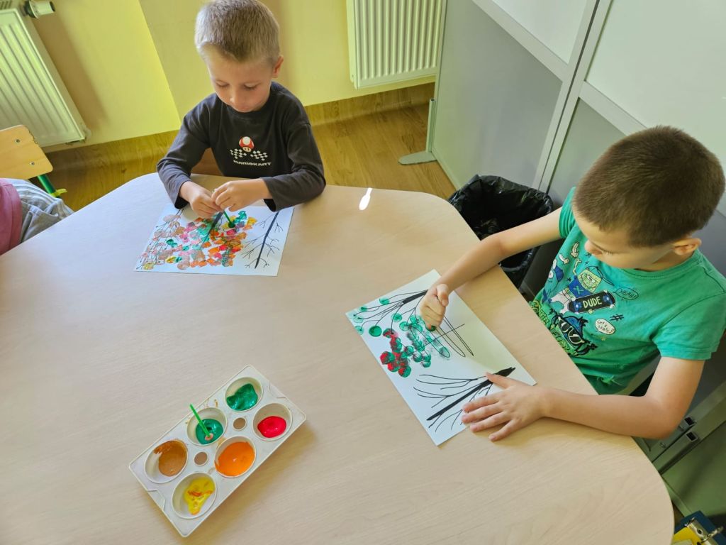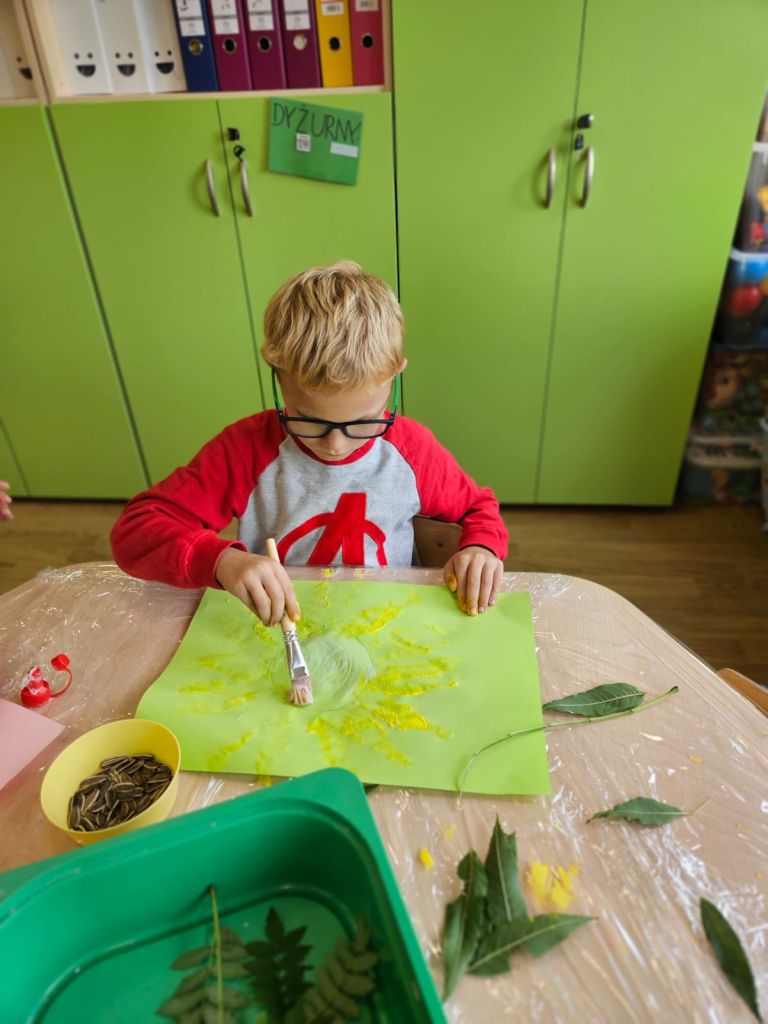 Podczas zajęć plastycznych tworzyliśmy prace o tematyce jesiennej – kolorowe liście, drzewa i owoce. Nie zabrakło także elementów sensoryki – dzieci miały możliwość doświadczać różnorodnych faktur, zapachów i kształtów, co sprawiło im dużo radości.