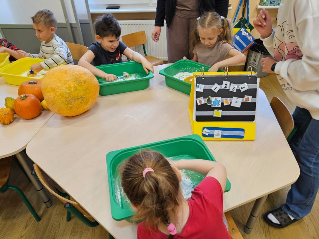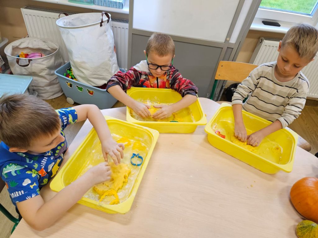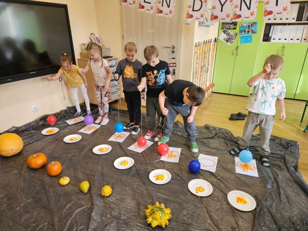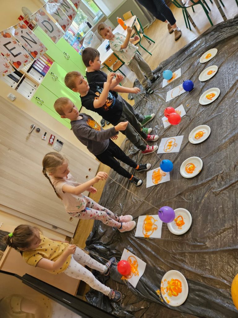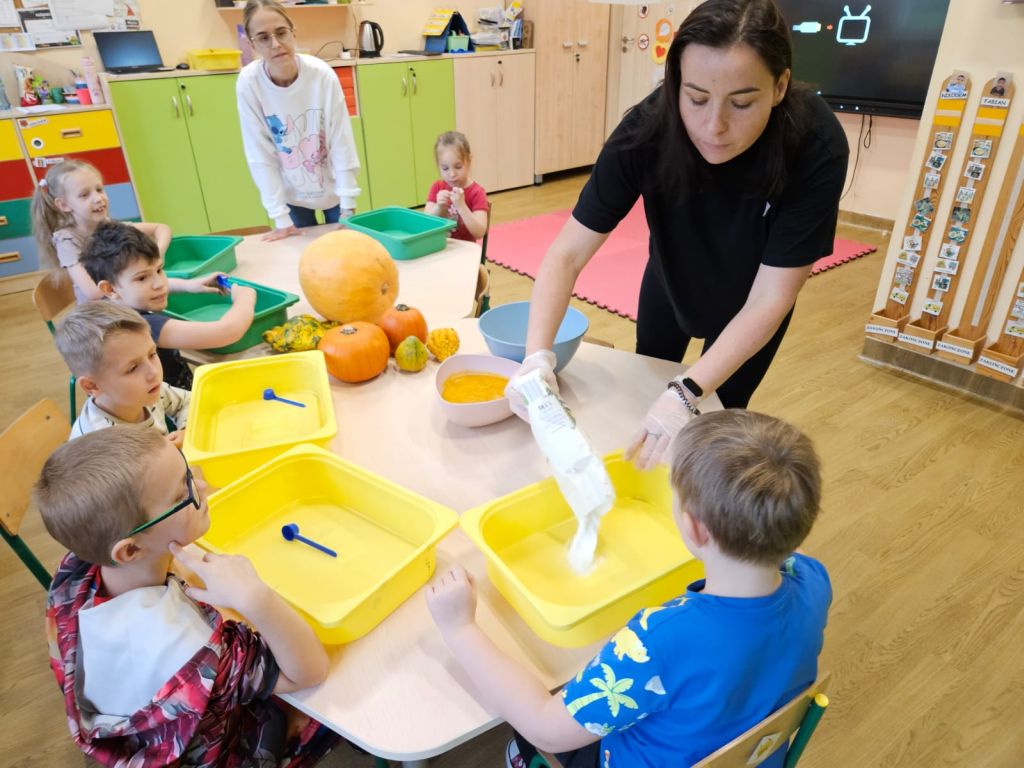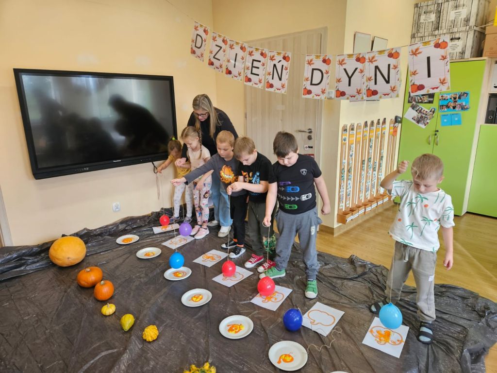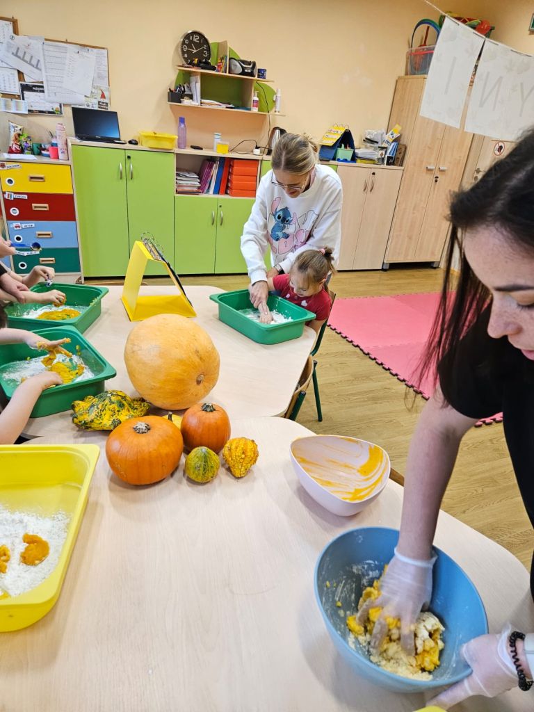 Słoneczka samodzielnie przygotowały pieczone ziemniaki, które potem z apetytem zjadały – nie zabrakło również pysznych frytek! Kolejną atrakcją był warsztat sensoryczny, podczas którego dzieci wykonały masę plastyczną z dyni, której faktura i zapach sprawiły im mnóstwo radości. Ponadto, dzieci malowały dyniowe obrazy za pomocą balonów, co stanowiło świetną okazję do rozwijania wyobraźni i zdolności manualnych.