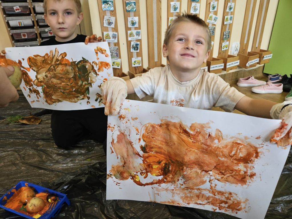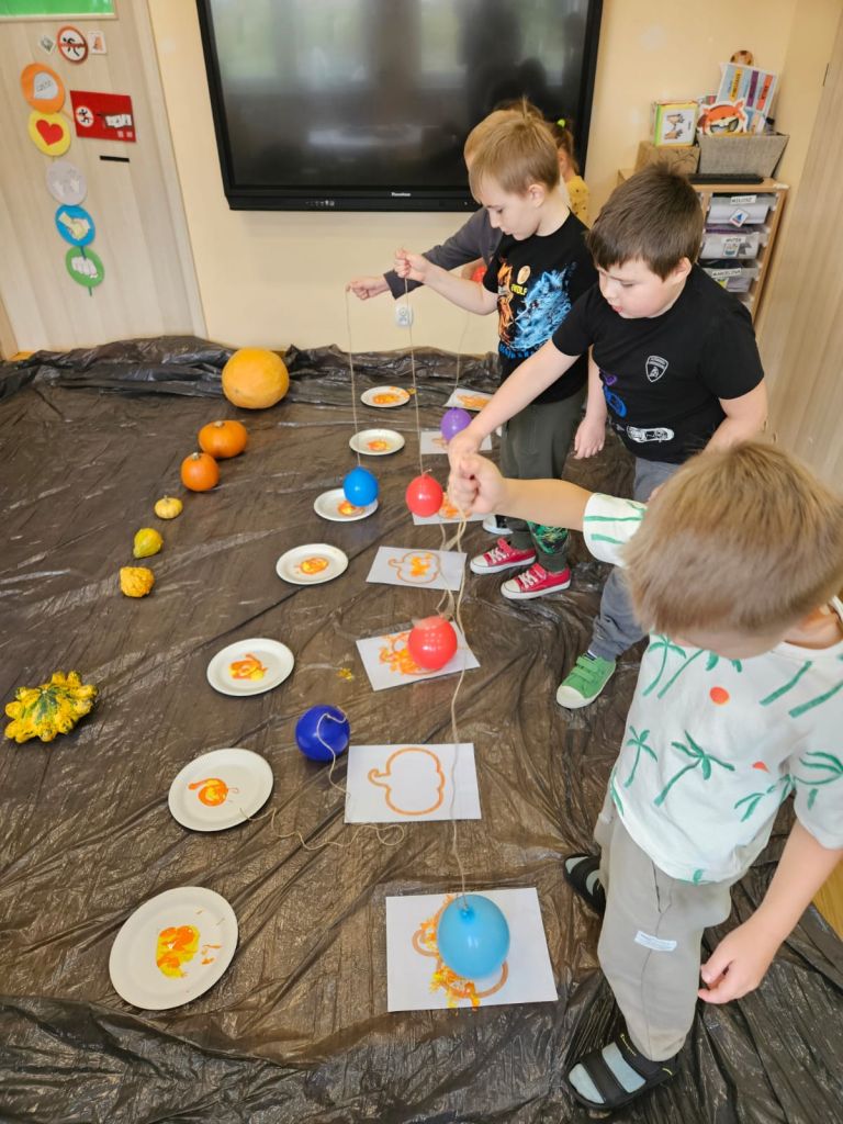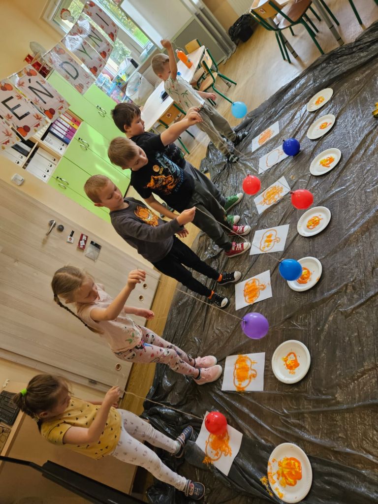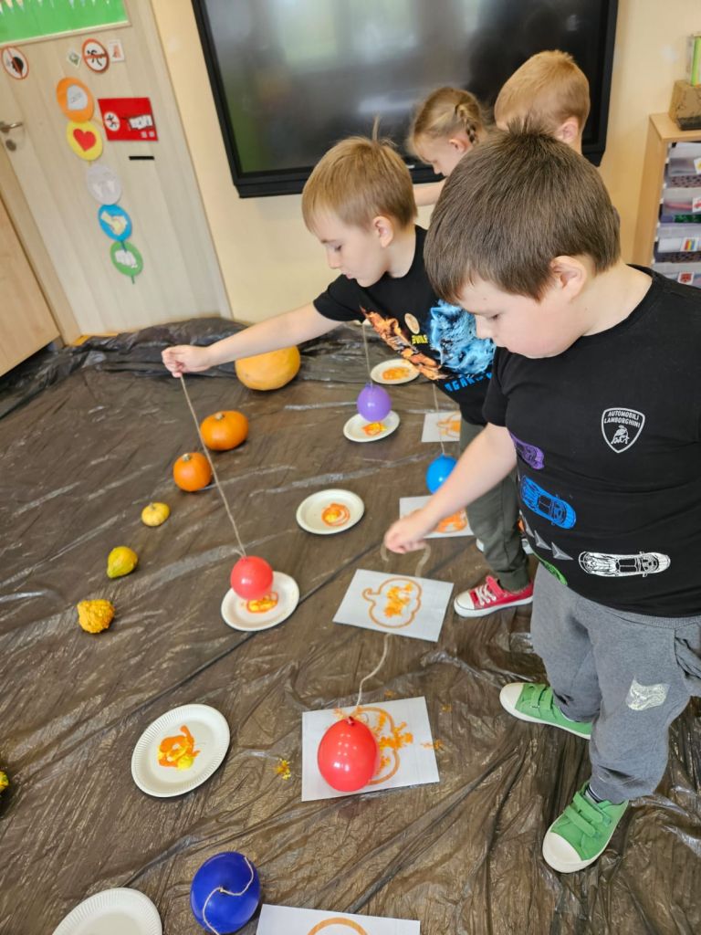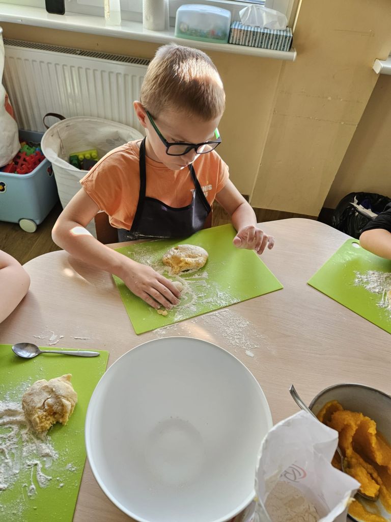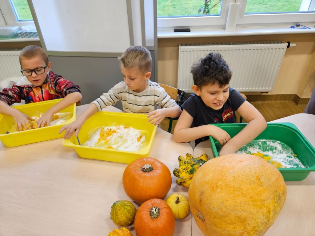 Słoneczka samodzielnie przygotowały pieczone ziemniaki, które potem z apetytem zjadały – nie zabrakło również pysznych frytek! Kolejną atrakcją był warsztat sensoryczny, podczas którego dzieci wykonały masę plastyczną z dyni, której faktura i zapach sprawiły im mnóstwo radości. Ponadto, dzieci malowały dyniowe obrazy za pomocą balonów, co stanowiło świetną okazję do rozwijania wyobraźni i zdolności manualnych.