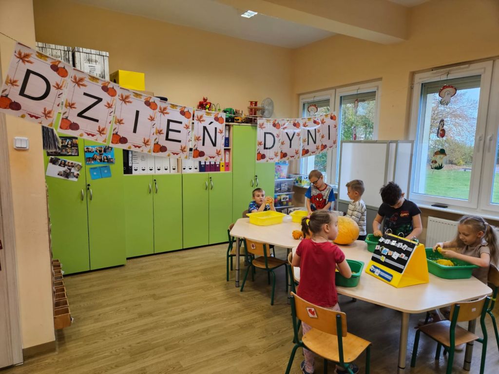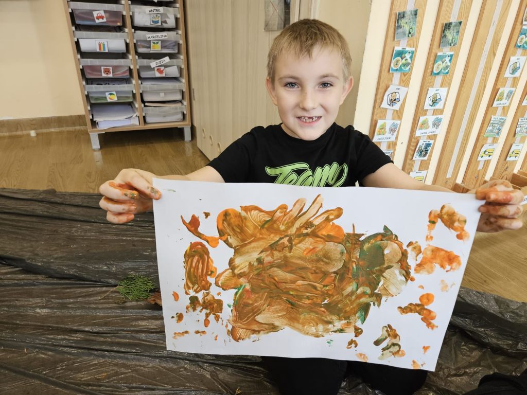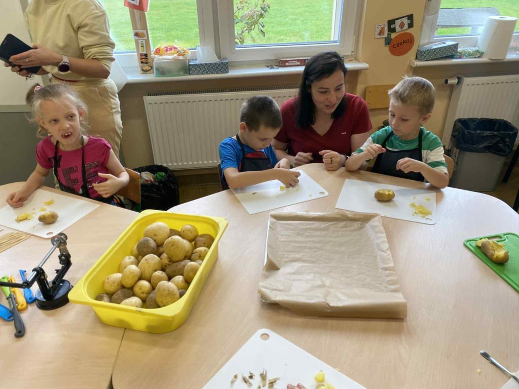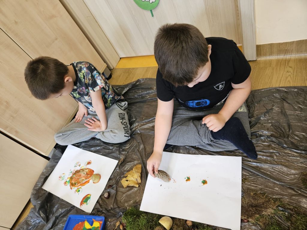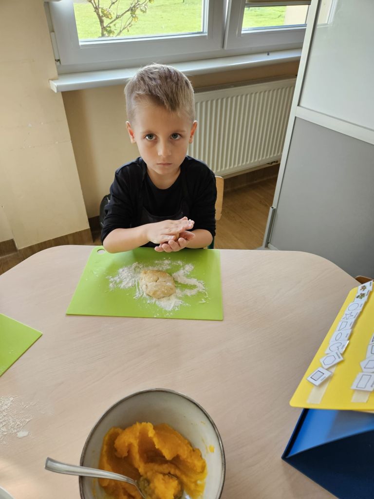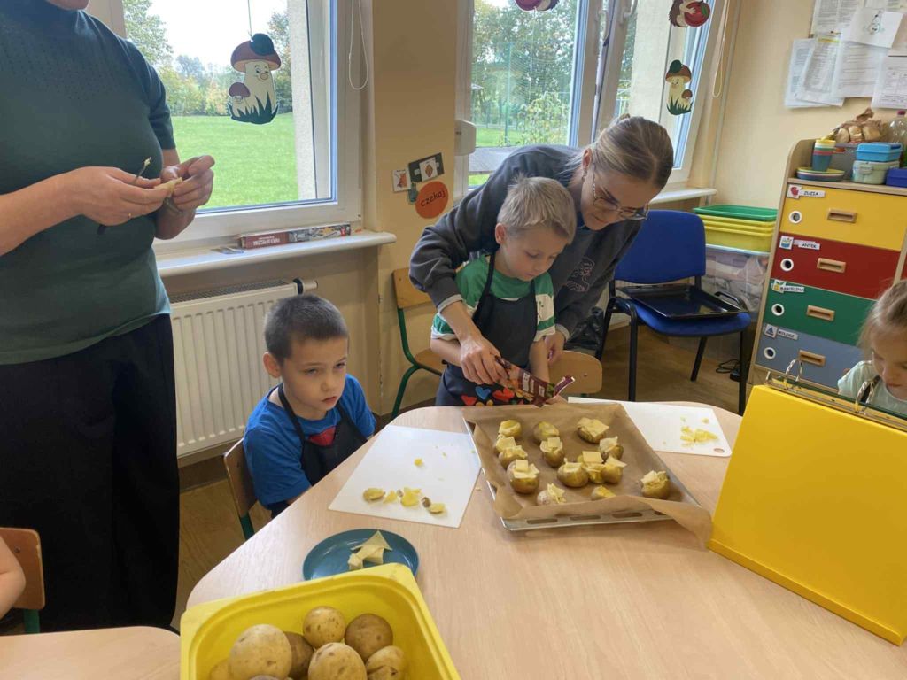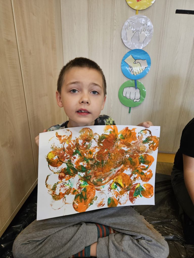 Słoneczka samodzielnie przygotowały pieczone ziemniaki, które potem z apetytem zjadały – nie zabrakło również pysznych frytek! Kolejną atrakcją był warsztat sensoryczny, podczas którego dzieci wykonały masę plastyczną z dyni, której faktura i zapach sprawiły im mnóstwo radości. Ponadto, dzieci malowały dyniowe obrazy za pomocą balonów, co stanowiło świetną okazję do rozwijania wyobraźni i zdolności manualnych.
