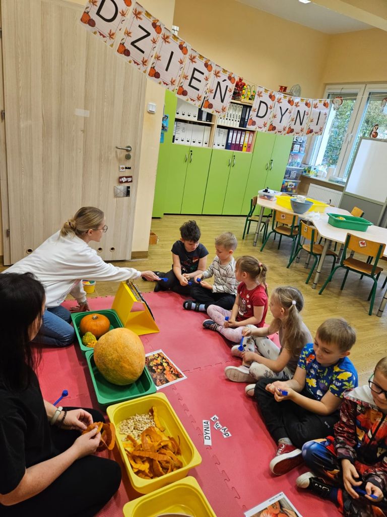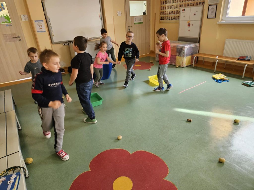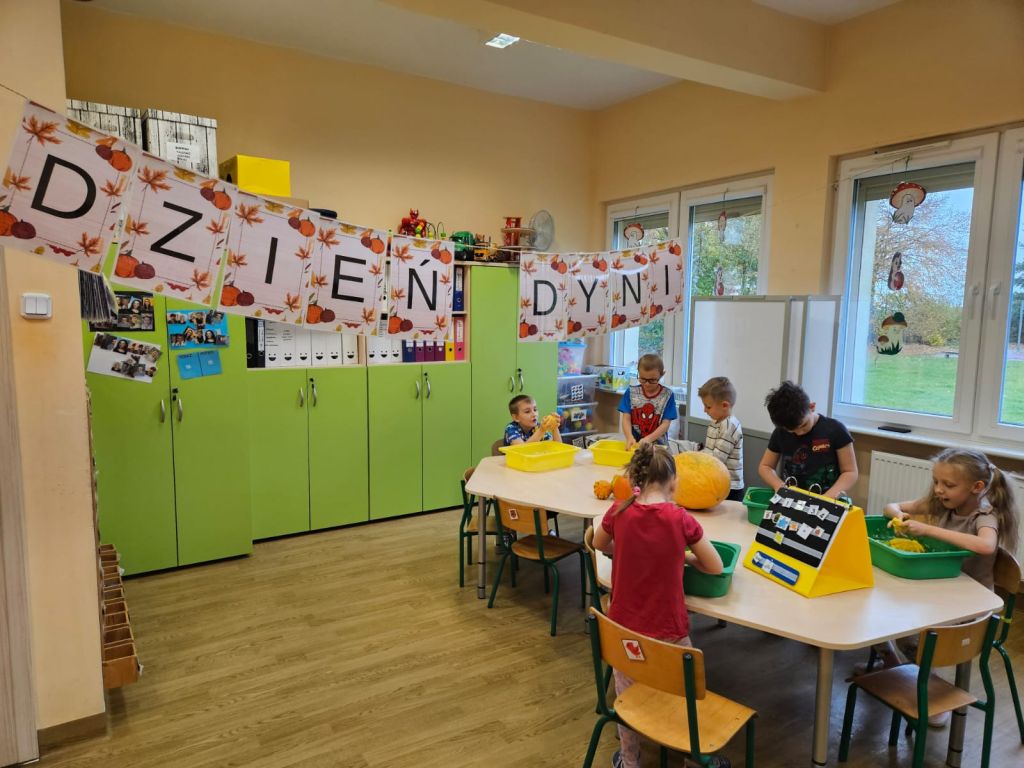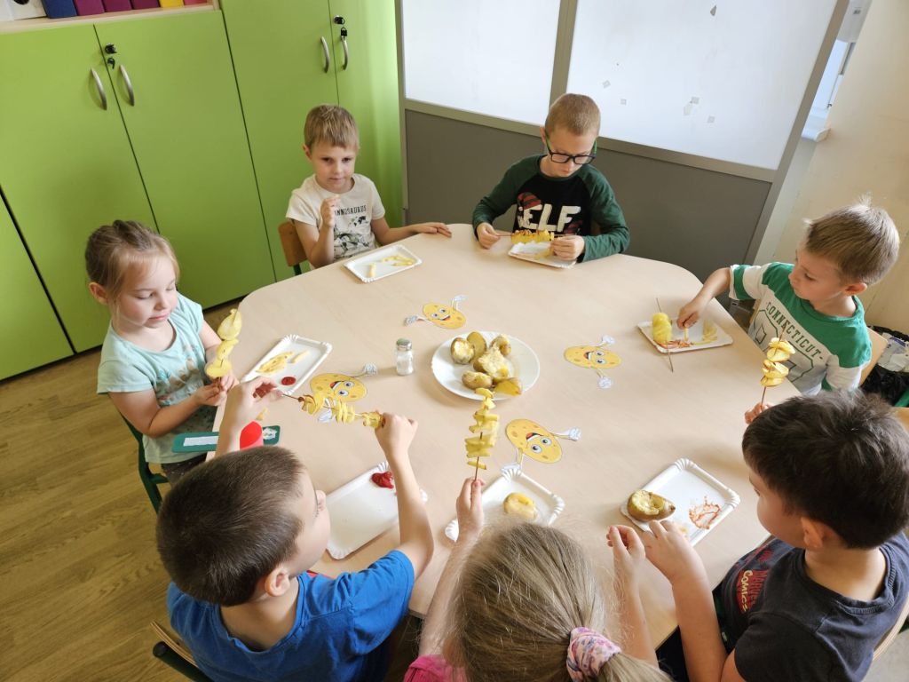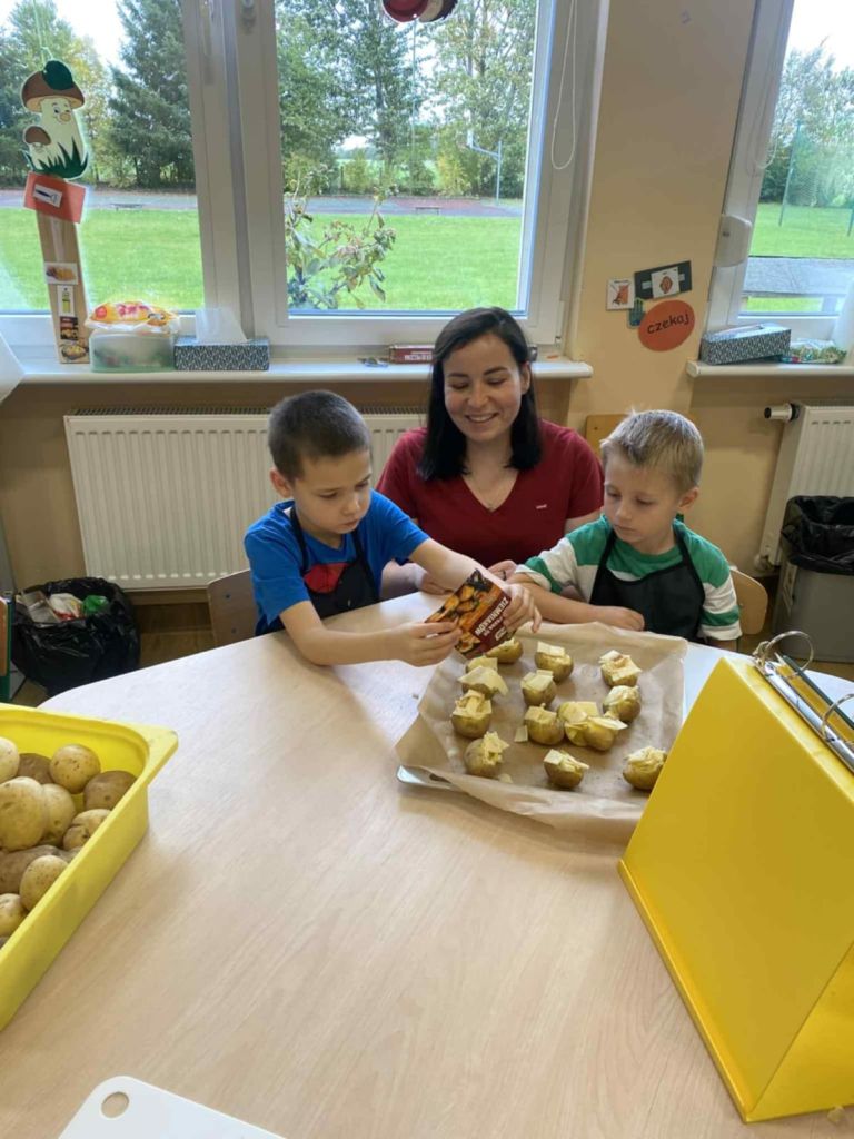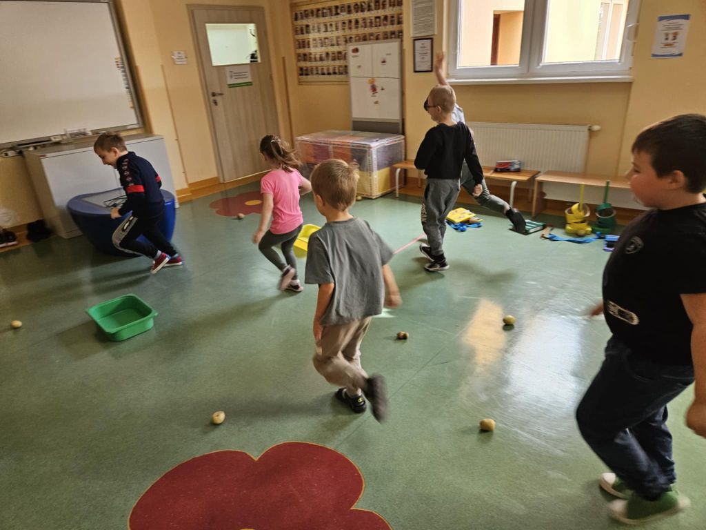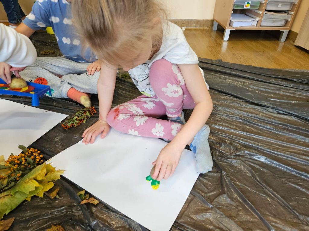 Słoneczka samodzielnie przygotowały pieczone ziemniaki, które potem z apetytem zjadały – nie zabrakło również pysznych frytek! Kolejną atrakcją był warsztat sensoryczny, podczas którego dzieci wykonały masę plastyczną z dyni, której faktura i zapach sprawiły im mnóstwo radości. Ponadto, dzieci malowały dyniowe obrazy za pomocą balonów, co stanowiło świetną okazję do rozwijania wyobraźni i zdolności manualnych.