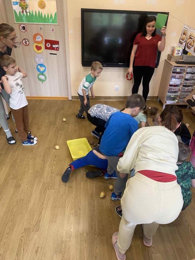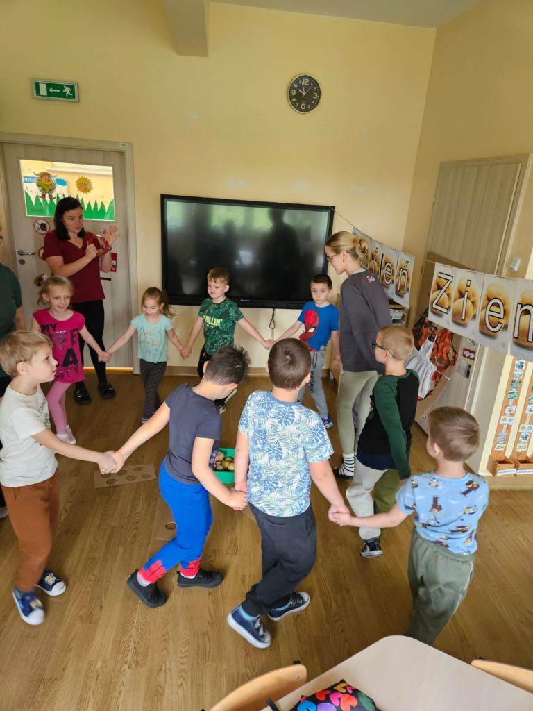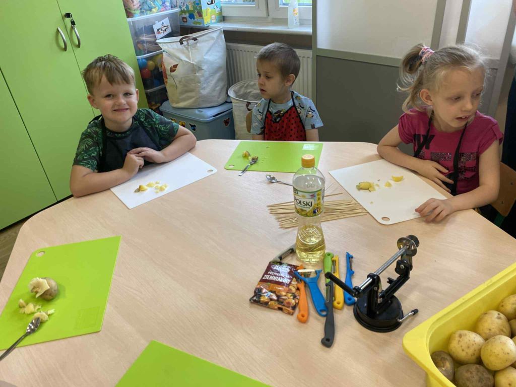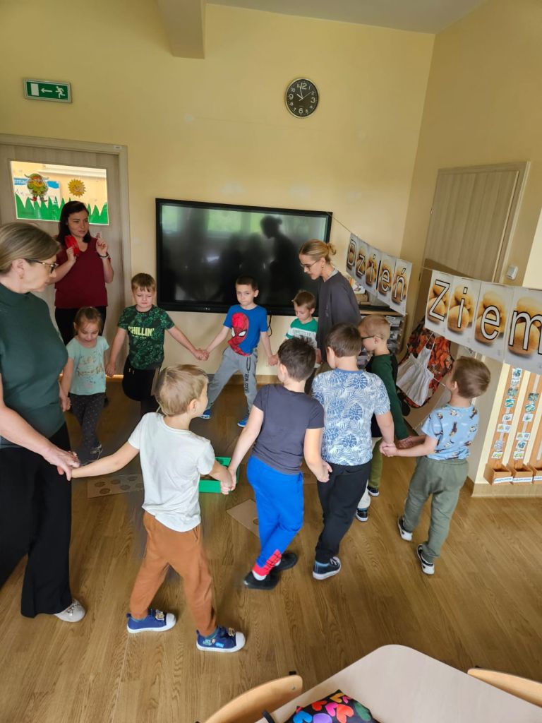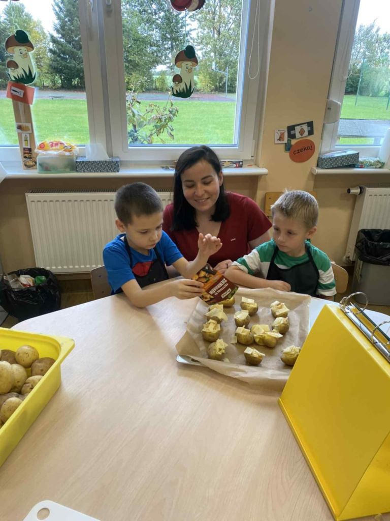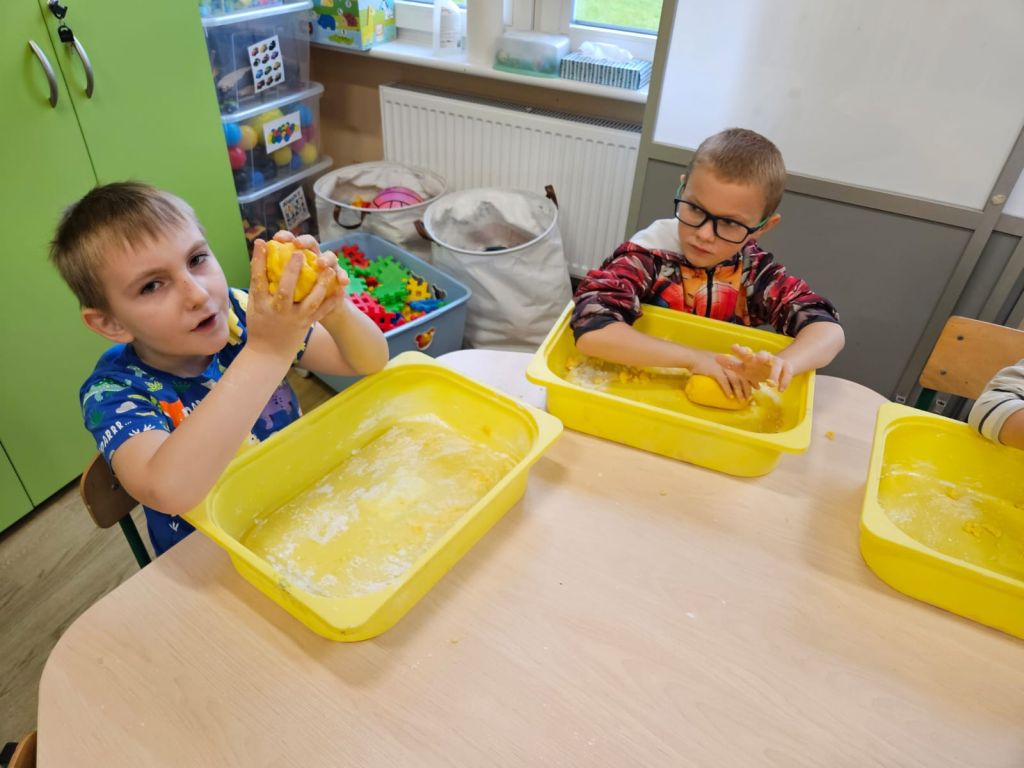 Słoneczka samodzielnie przygotowały pieczone ziemniaki, które potem z apetytem zjadały – nie zabrakło również pysznych frytek! Kolejną atrakcją był warsztat sensoryczny, podczas którego dzieci wykonały masę plastyczną z dyni, której faktura i zapach sprawiły im mnóstwo radości. Ponadto, dzieci malowały dyniowe obrazy za pomocą balonów, co stanowiło świetną okazję do rozwijania wyobraźni i zdolności manualnych.