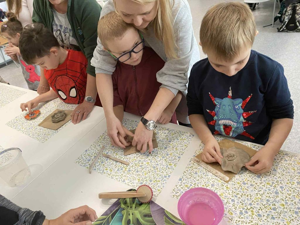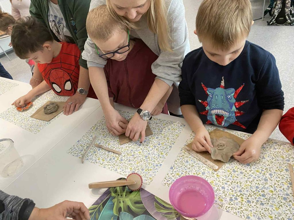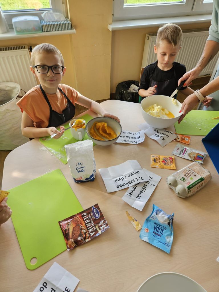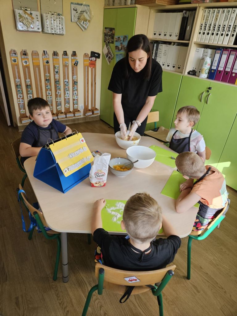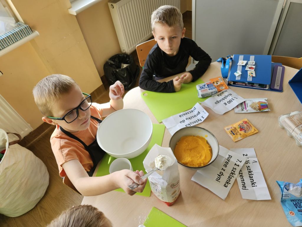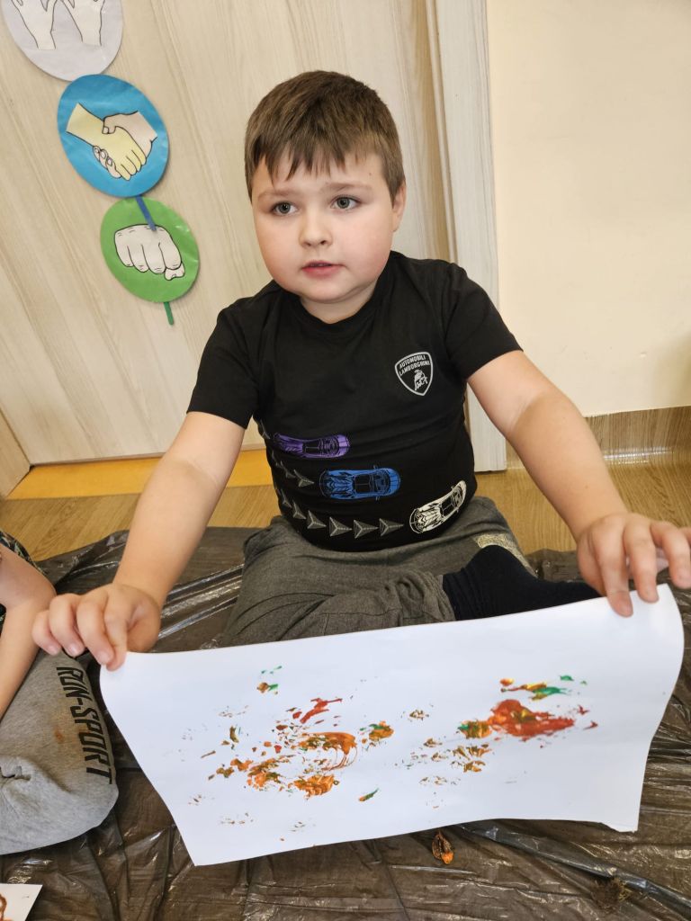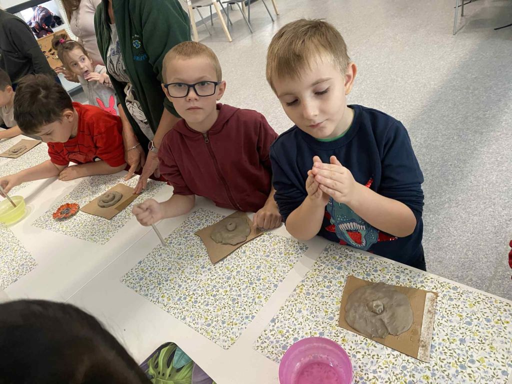 Słoneczka samodzielnie przygotowały pieczone ziemniaki, które potem z apetytem zjadały – nie zabrakło również pysznych frytek! Kolejną atrakcją był warsztat sensoryczny, podczas którego dzieci wykonały masę plastyczną z dyni, której faktura i zapach sprawiły im mnóstwo radości. Ponadto, dzieci malowały dyniowe obrazy za pomocą balonów, co stanowiło świetną okazję do rozwijania wyobraźni i zdolności manualnych.