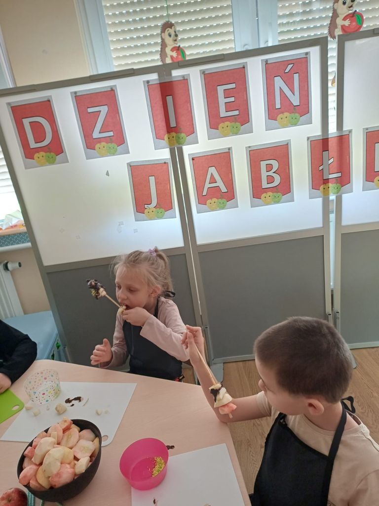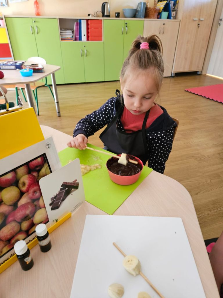 Następnego dnia sala przedszkolna wypełniła się zapachem roztopionej czekolady. Tym razem przygotowywaliśmy owoce w czekoladzie. Każdy przedszkolak mógł samodzielnie zanurzyć owoce w ciepłej polewie i udekorować je według własnego pomysłu. Efekt był pyszny.