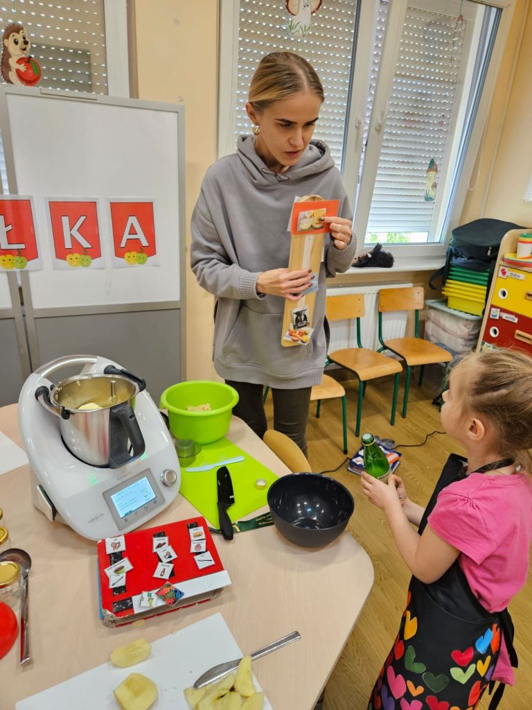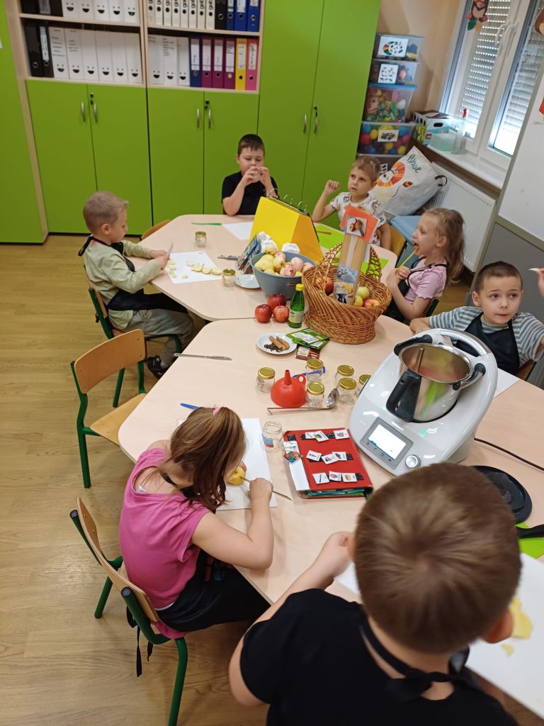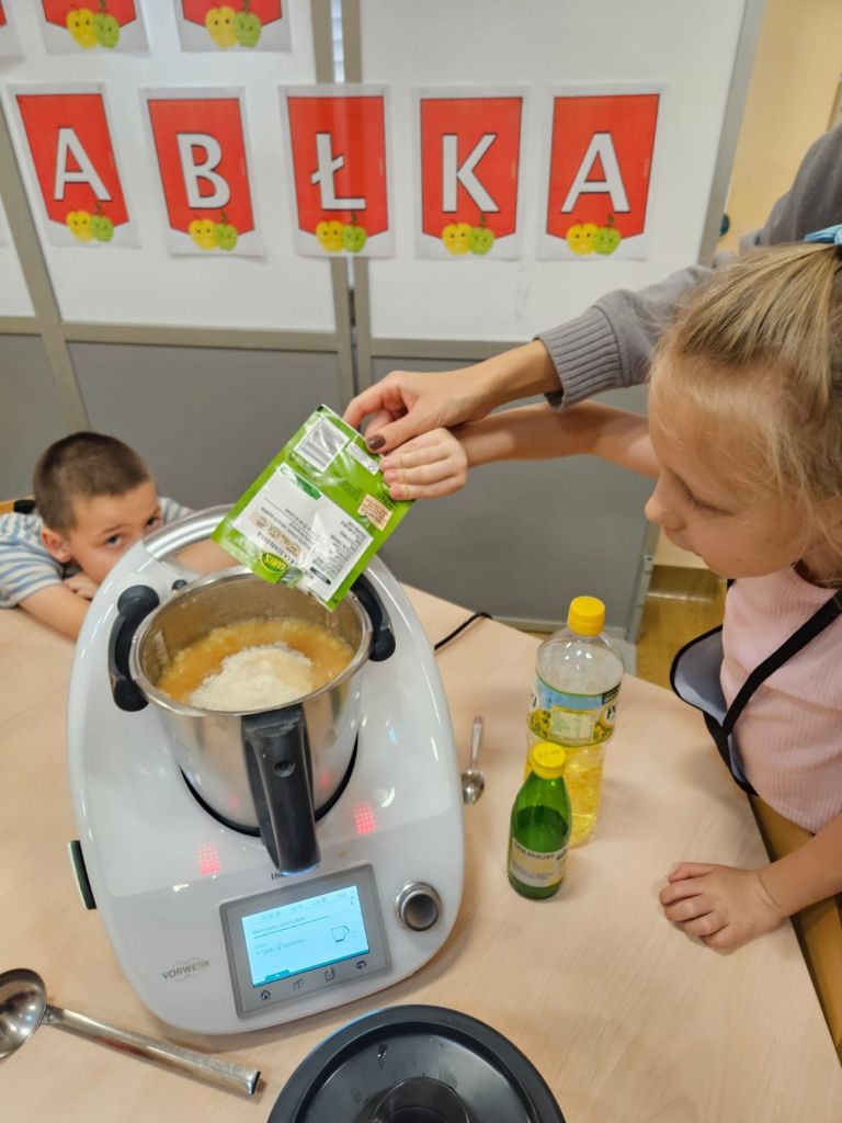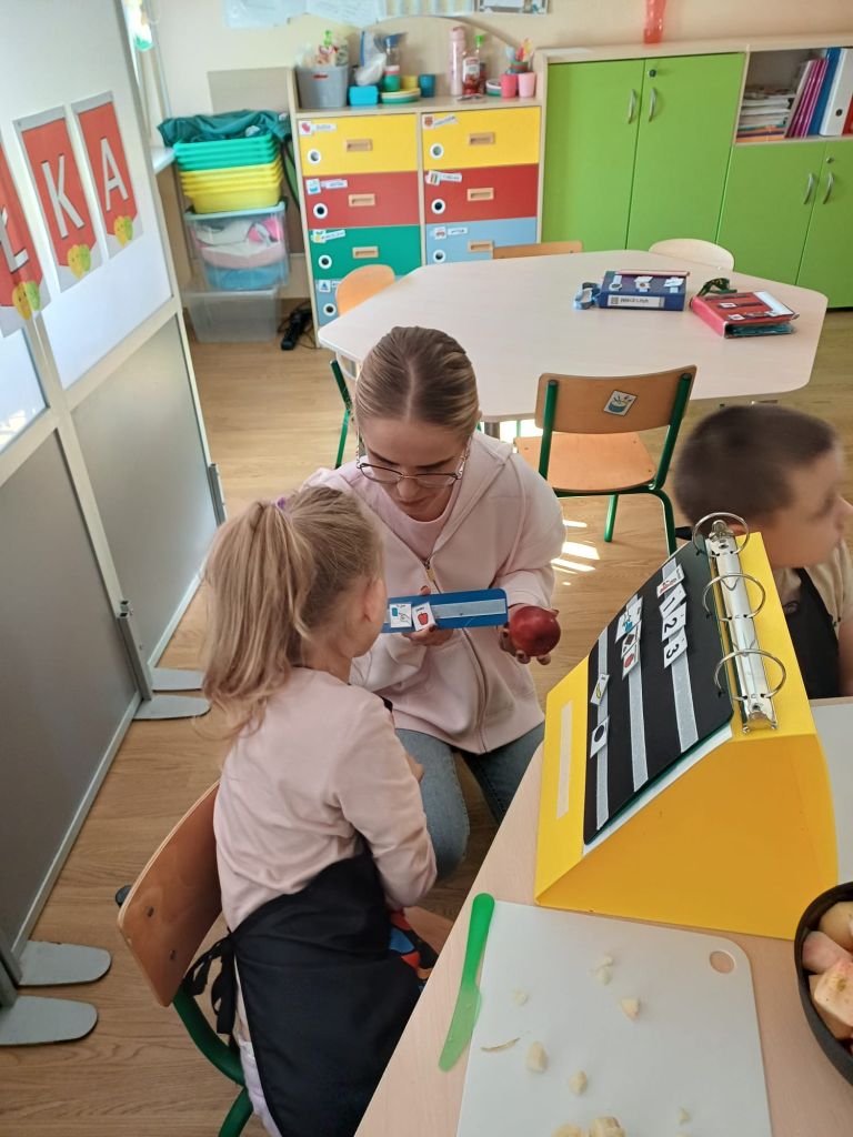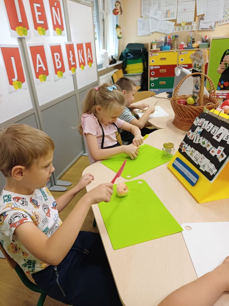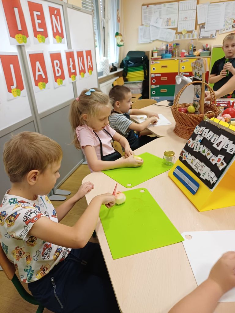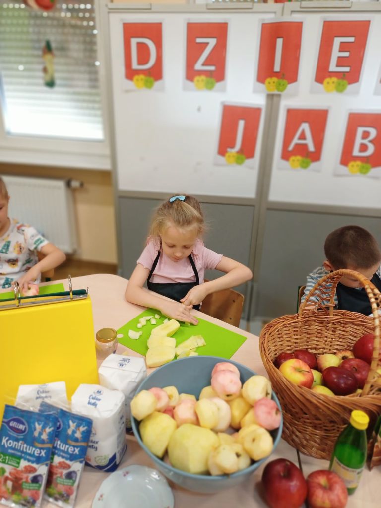 W tym tygodniu dzieci uczyły się kroić jabłka na kawałki. Była to doskonała okazja, by ćwiczyć cierpliwość, skupienie i sprawność dłoni. Pokrojone owoce zmieniły się w pyszny mus jabłkowy, który dzieci zabrały do domu, aby poczęstować rodzinę i wspólnie cieszyć się smakiem jesieni.
