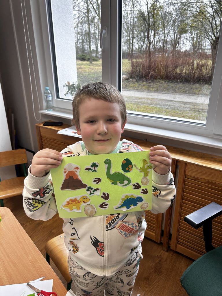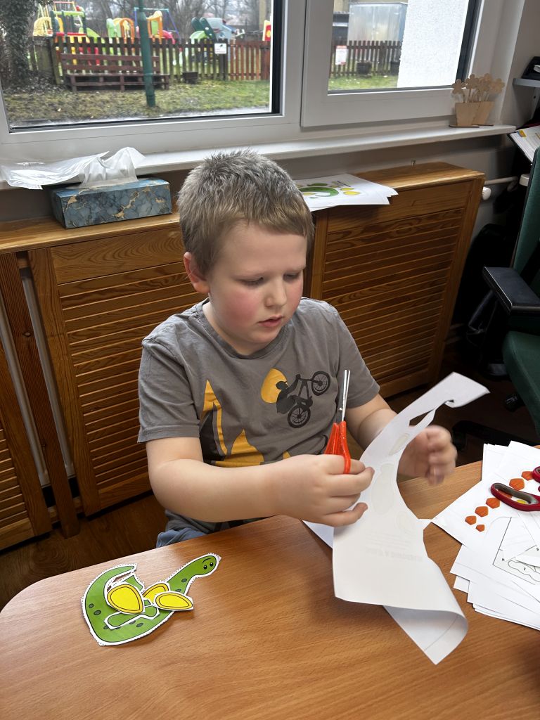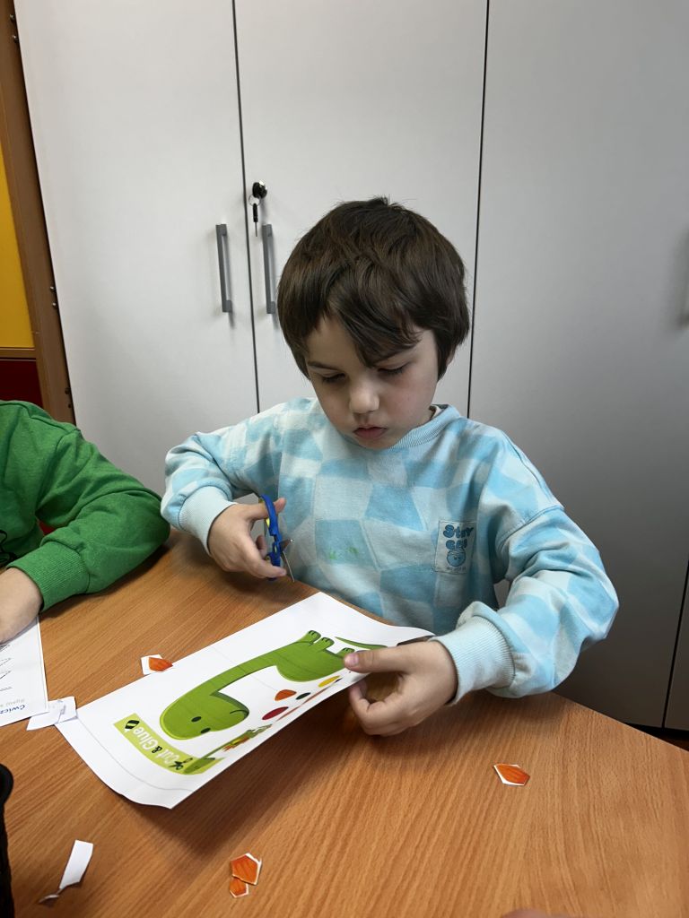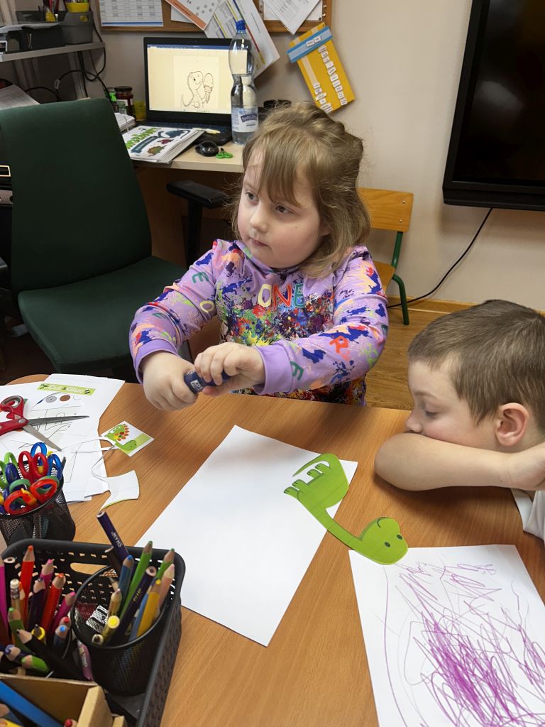 Po zajęciach teoretycznych przystąpiły do pracy plastycznej, w której wycinały i kolorowały sylwetki dinozaurów. To ćwiczenie nie tylko rozwijało ich kreatywność, ale także wspierało motorykę małą, co jest niezwykle ważne w tym wieku. Efekty ich pracy były niezwykle kolorowe i pomysłowe