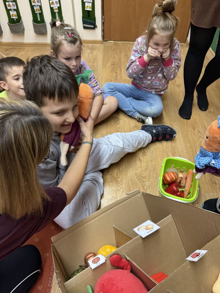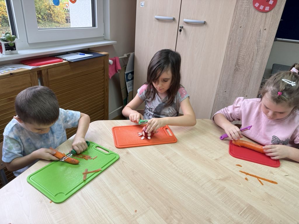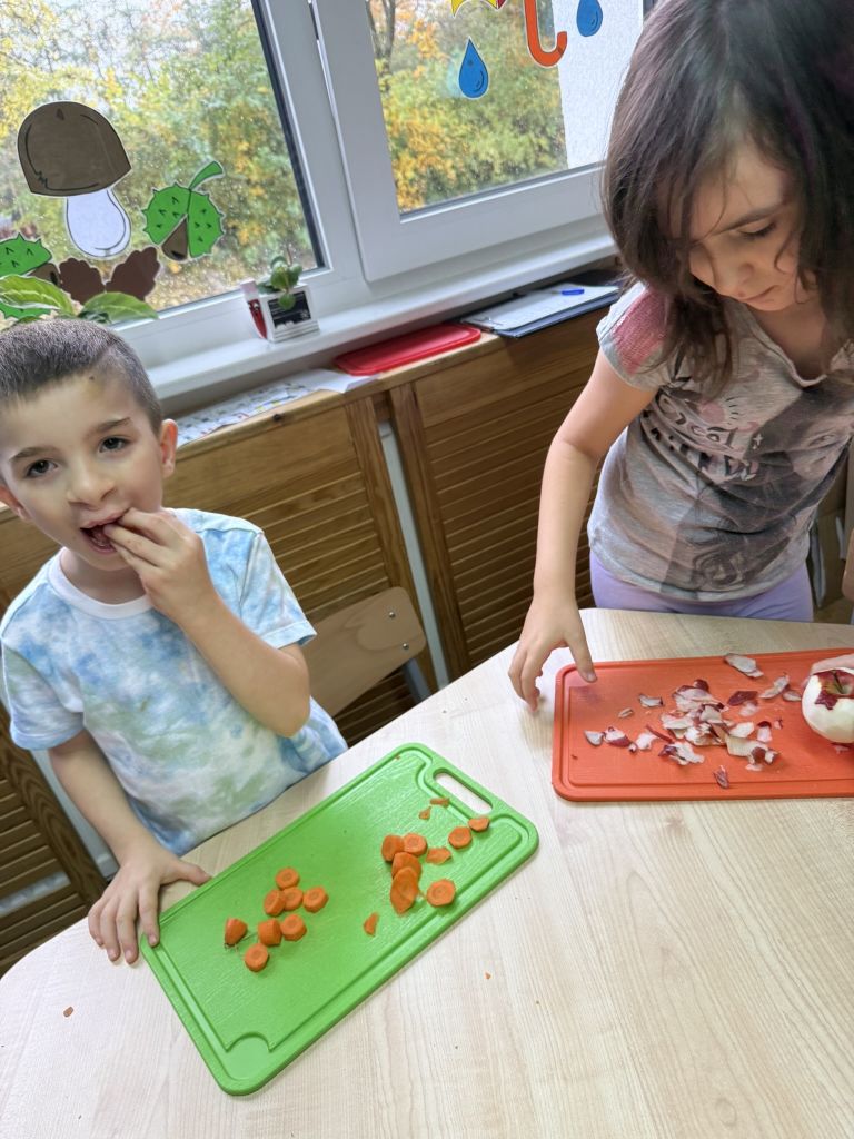 Zaczynając od wycieczki do sklepu, gdzie każdy mógł wybrać produkty potrzebne do zajęć, gdzie będą uczyć się obierać, kroić i próbować nowych warzyw. Następnie z zaangażowaniem uczestnictwo w teatrzyku „Warzywniak marchewek”. Podczas przedstawienia przedszkolaki nazywały i dopasowywały prawdziwe i zabawkowe warzywa, rozwijając spostrzegawczość, komunikację i umiejętność klasyfikowania.