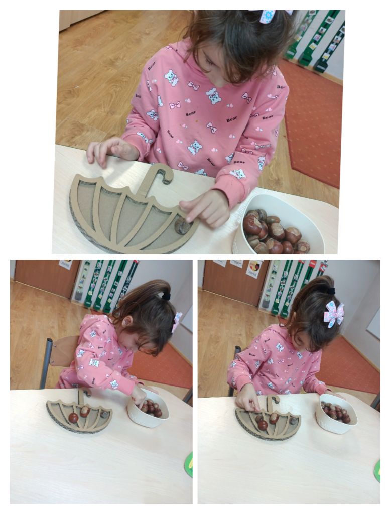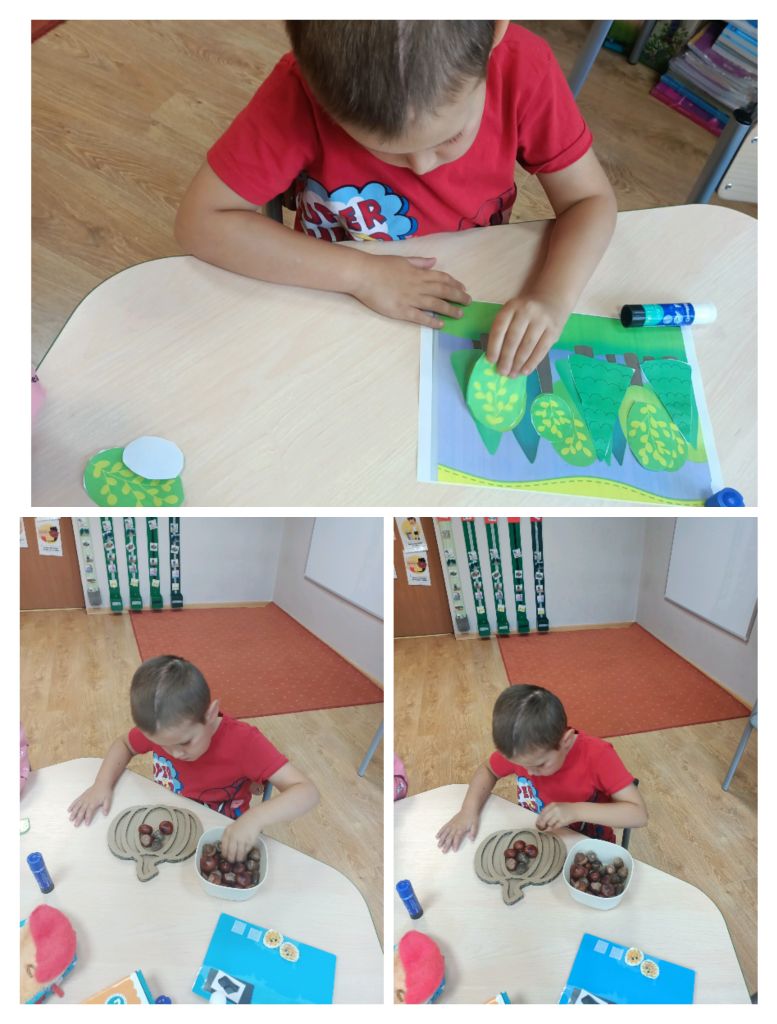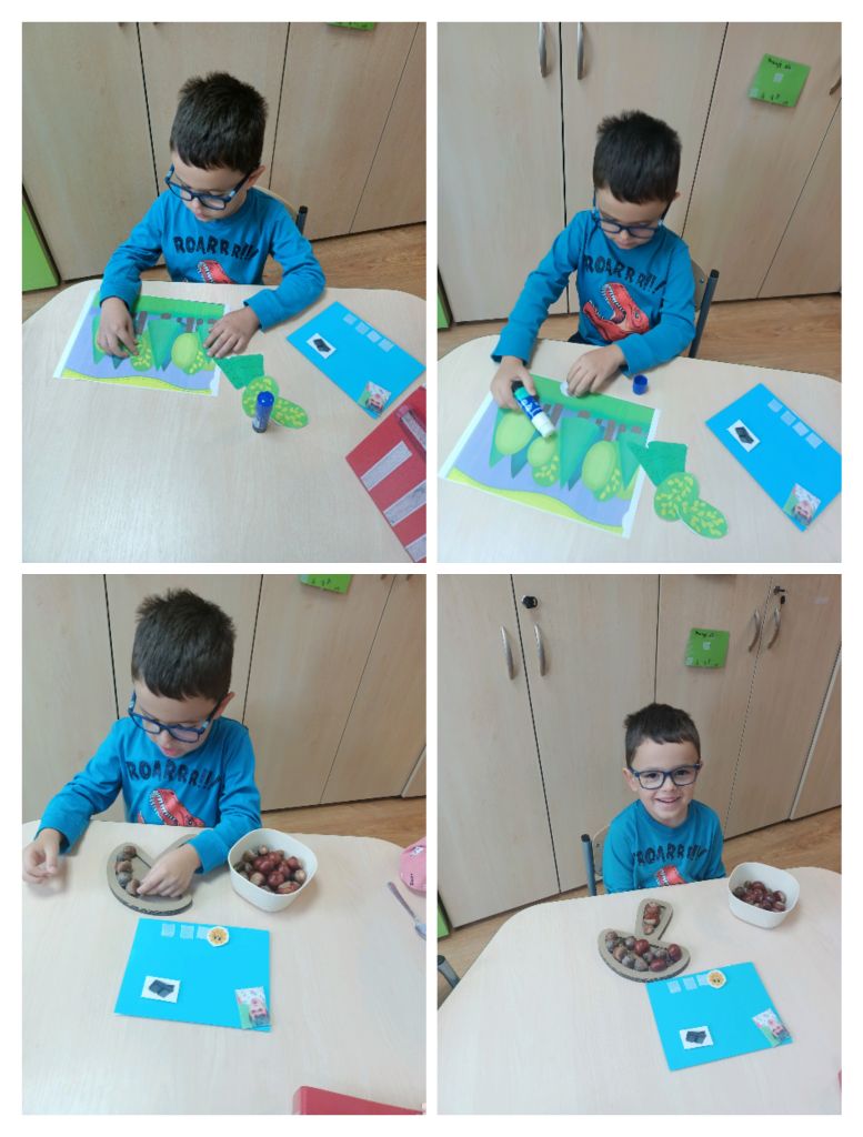 W grupie „Tygryski” Nadia, Hubert, Franek, Olek oraz Jasiu wykonywali różnorodne aktywności skupione na tematyce jesiennej, poszli na spacer w celu zbierania darów jesieni (kasztany, żołędzie), które później układali w sensorycznych kształtach (dynia, grzyb, parasol itp.).