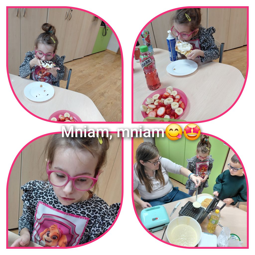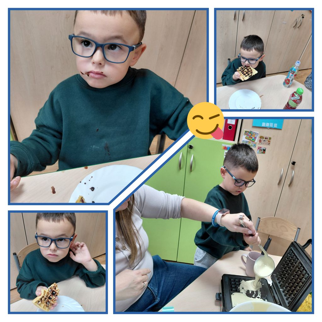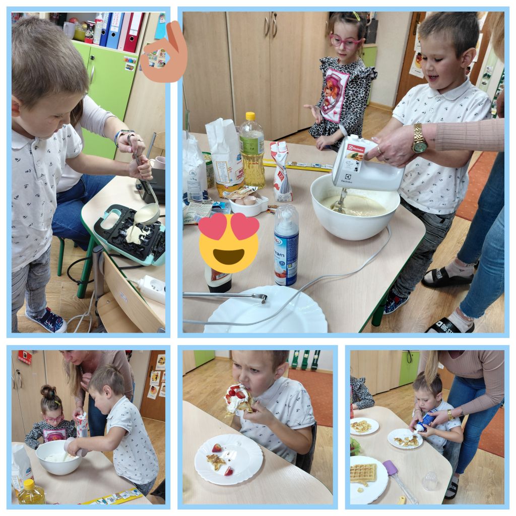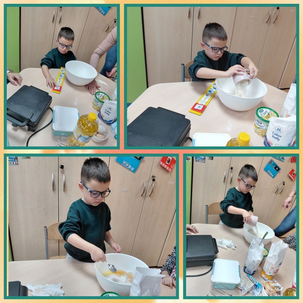 Pewnego październikowego dnia dzieci z grupy „Tygryski” osłodziły sobie dzień robiąc przepyszne gofry. Hubert, Jasiu oraz Nadia wrzucali składniki do miski korzystając z mini planu aktywności.