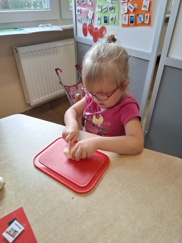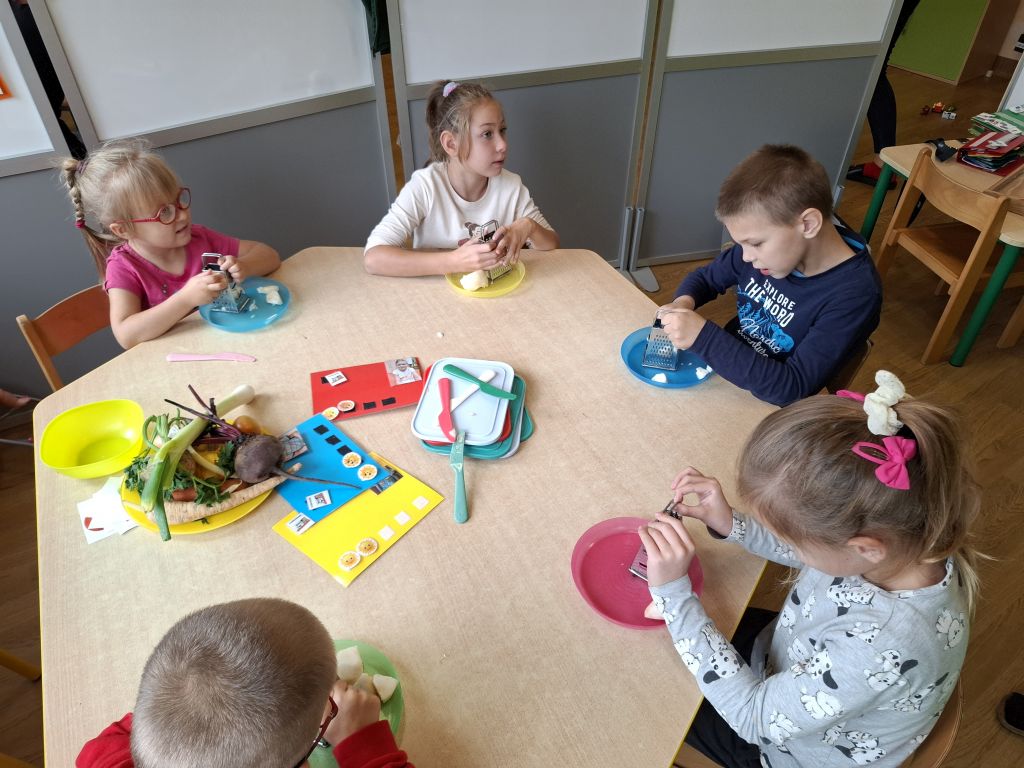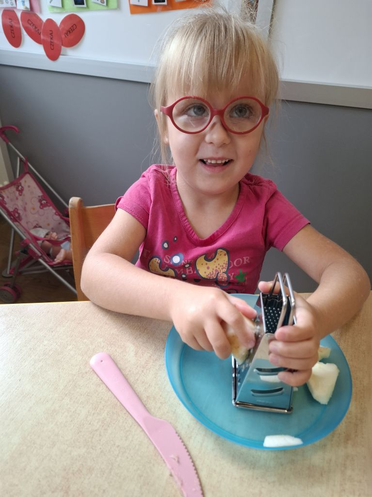 Mogły zapoznać się z wyglądem i nazwami wybranych warzyw, określić ich kolor i kształt, powąchać, jaki mają zapach. Oprócz zabaw sensorycznych odbyły się warsztaty kulinarne, na które nasze przedszkolaki wybrały sobie popularny owoc czyli jabłko. Najpierw kroiły owoc na kawałki, następnie tarły na wiórki i degustowały.