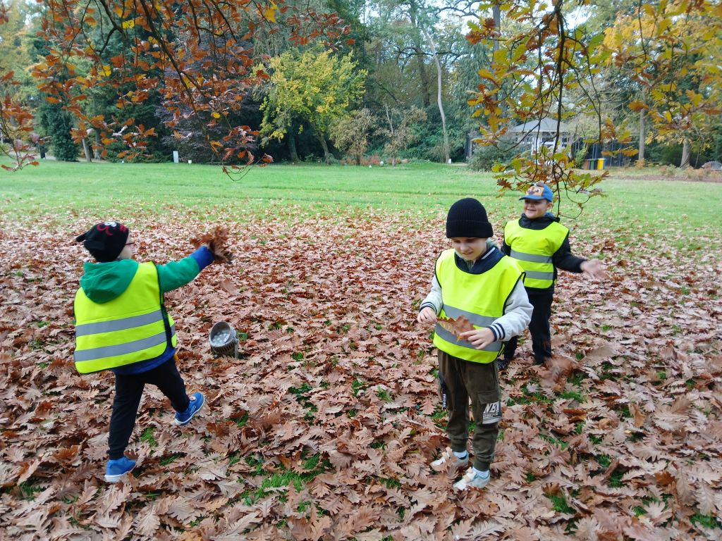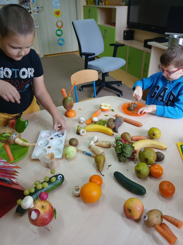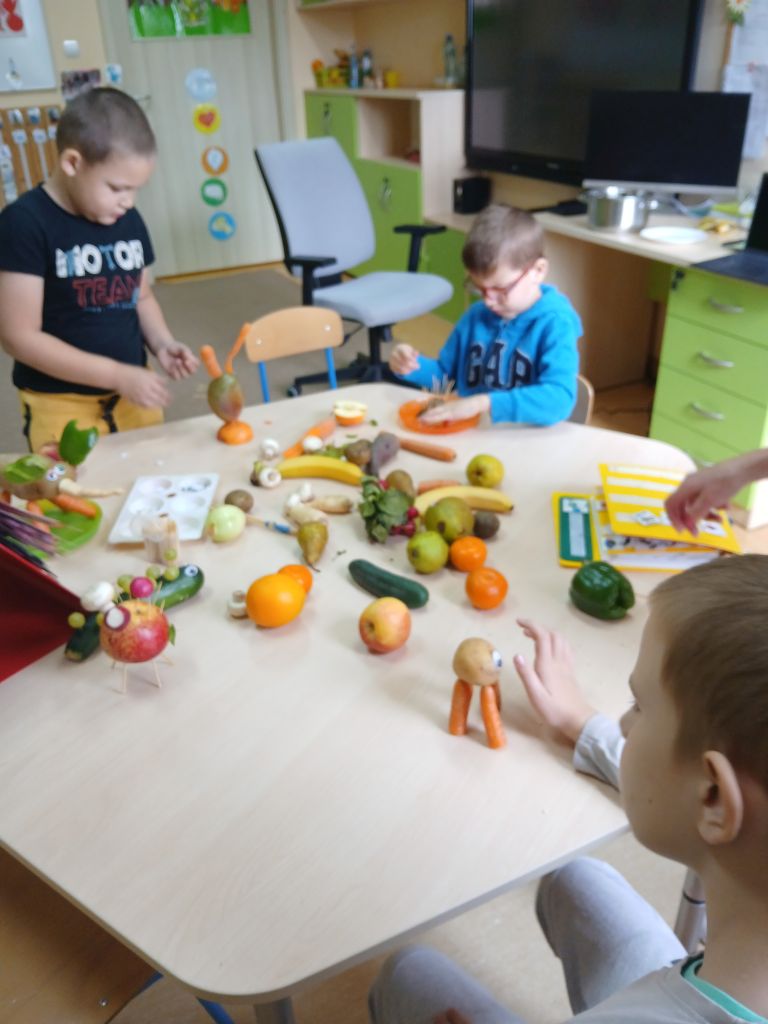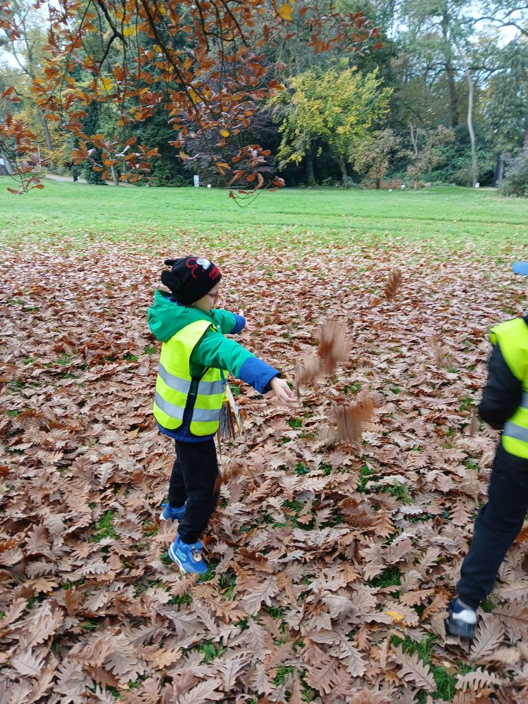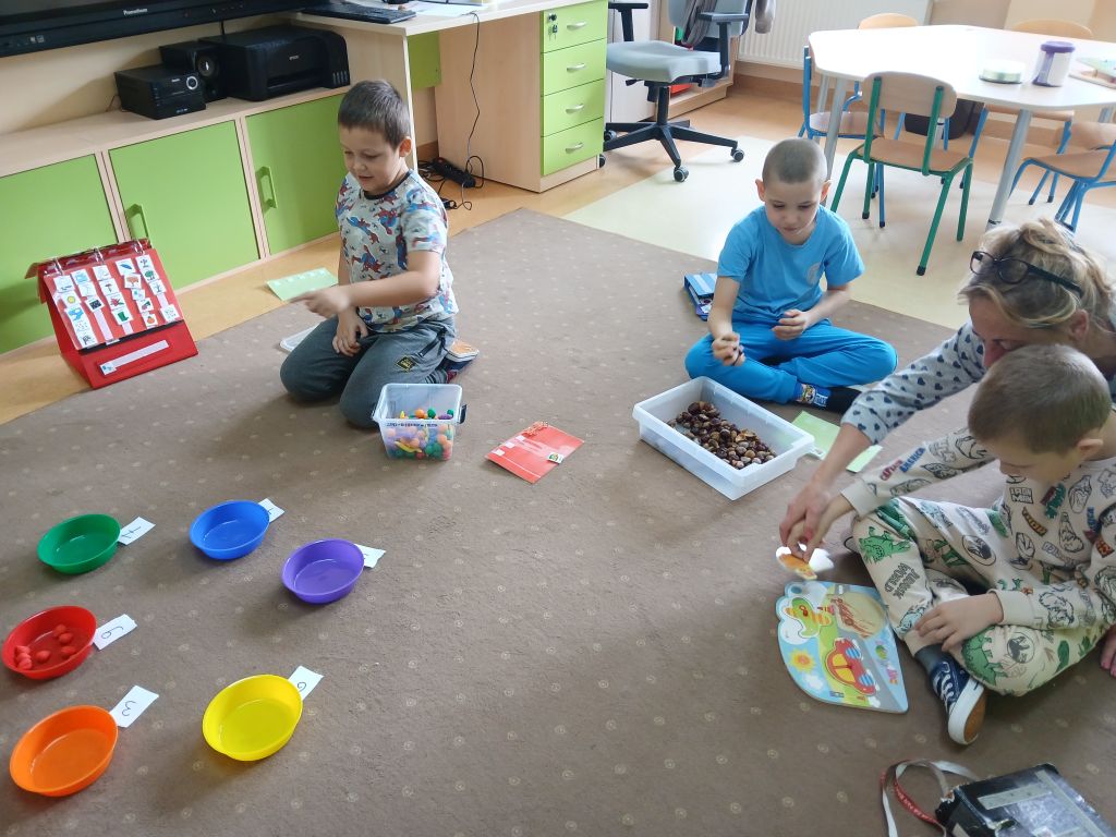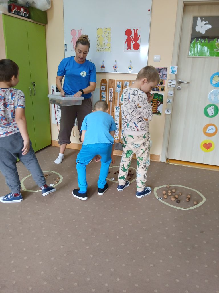 Dzieci uczestniczyły w różnorodnych jesiennych aktywnościach. Podczas zabaw poznawały i wykorzystywały jesienne atrybuty – kolorowe liście, kasztany i żołędzie.